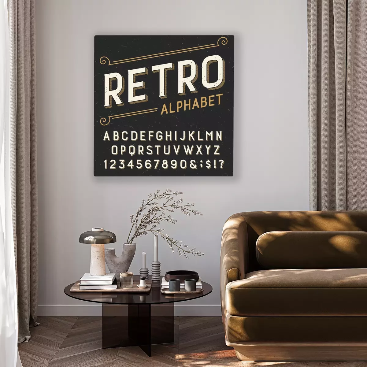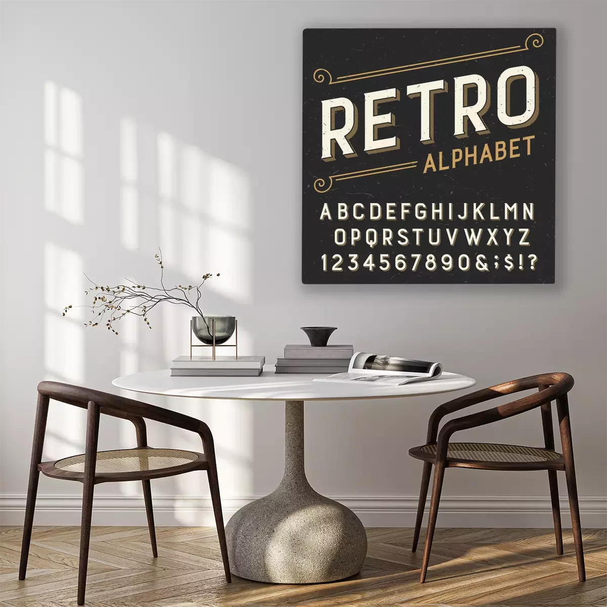 Tableau  Rétro police vectorielle alphabet. Serif lettres type, chiffres et symboles. sur un fond rayé détresse sombre. Vectoriel typographie pour les étiquettes, titres, affiches, etc.