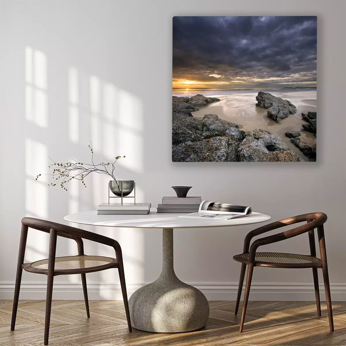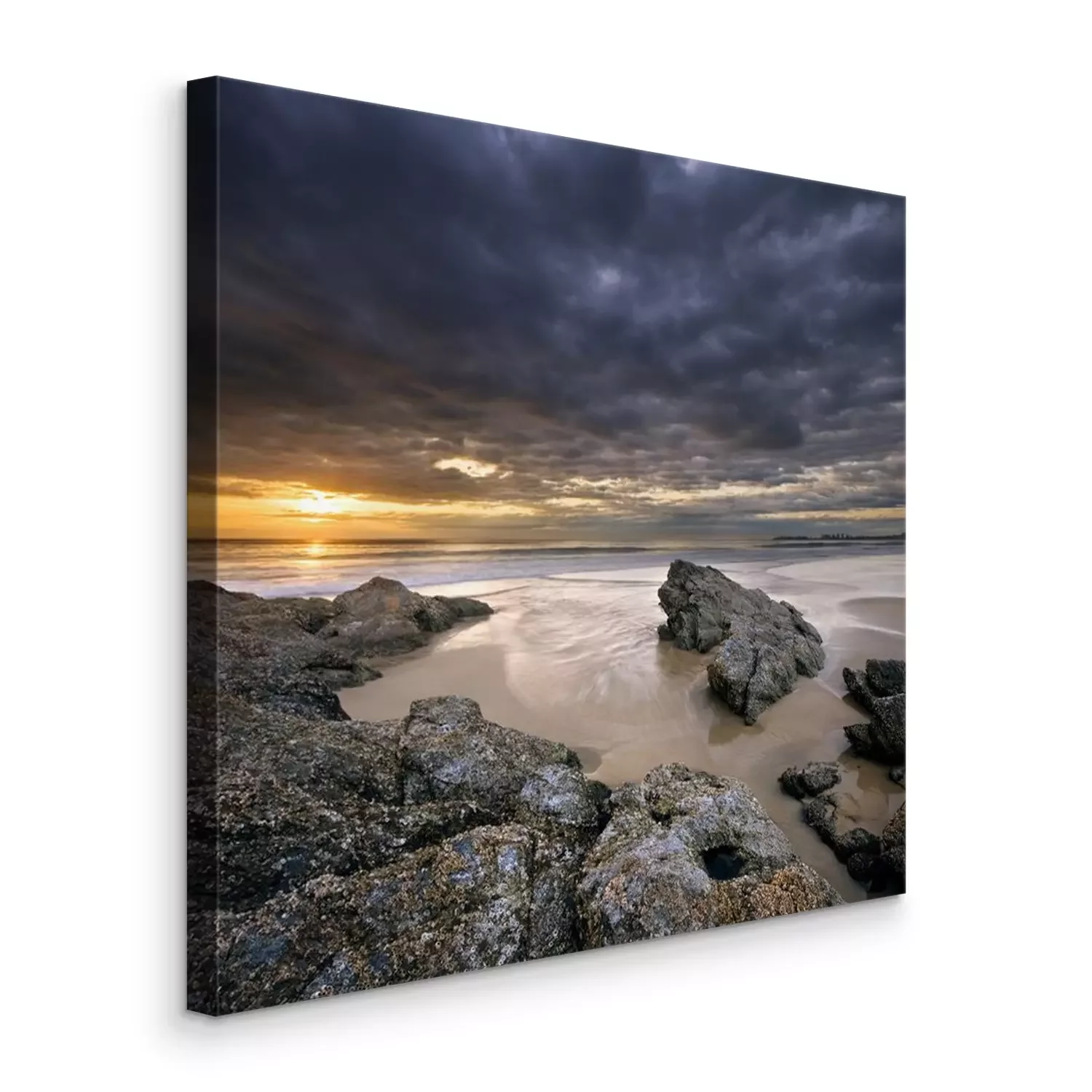Tableau  roches sur la plage au lever du soleil avec un ciel dramatique