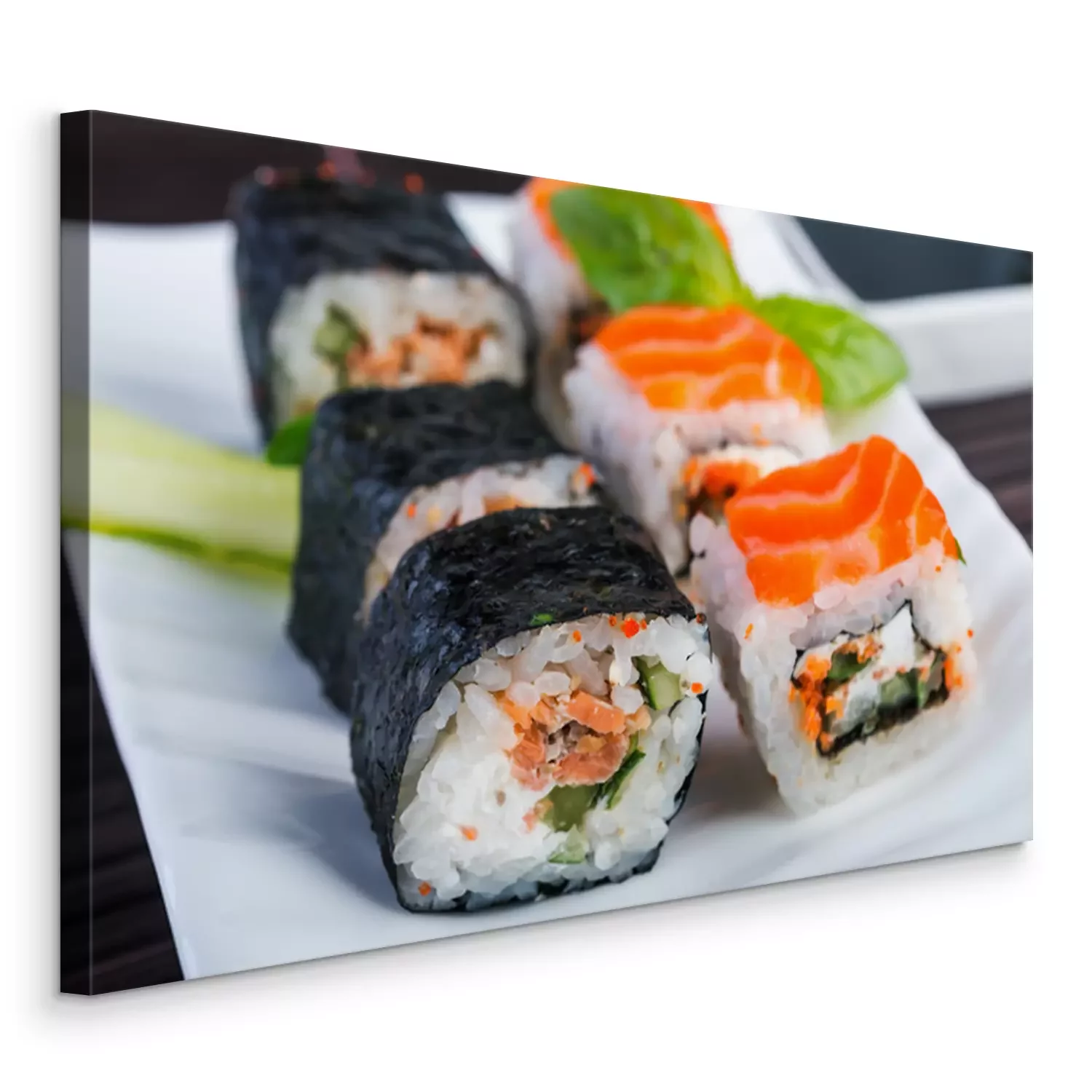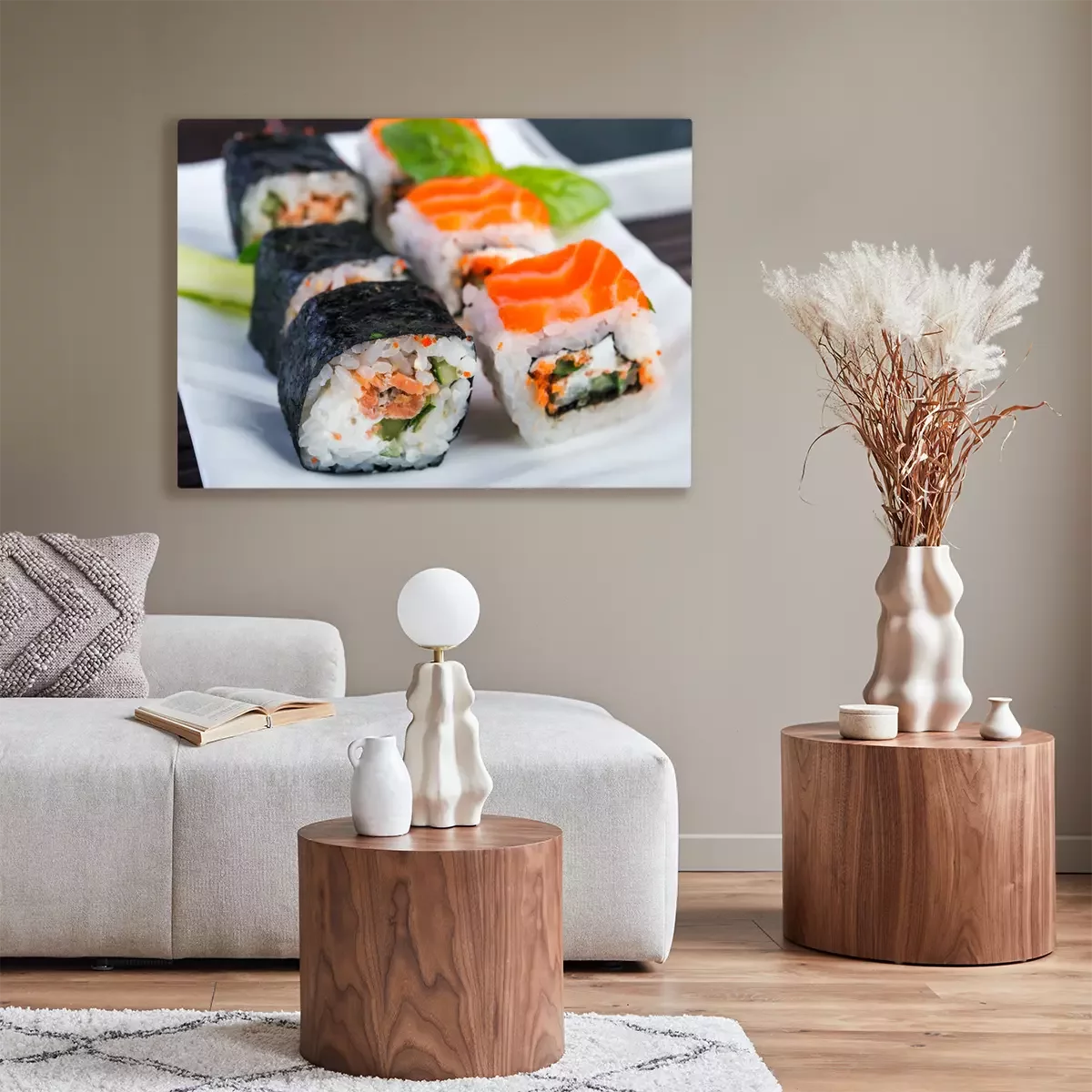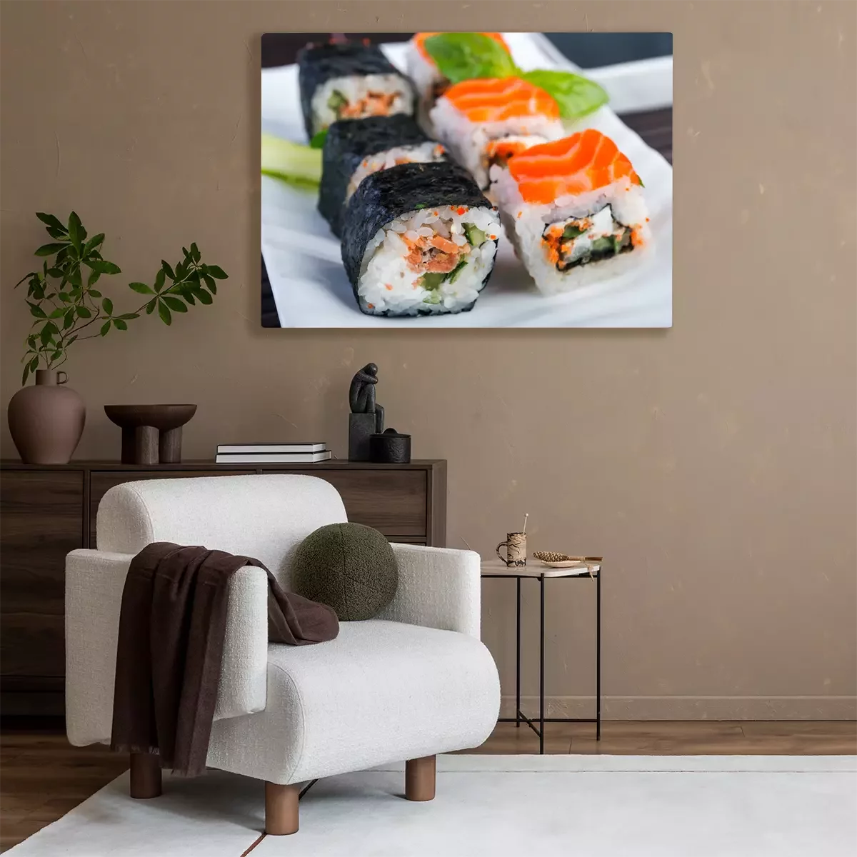 Tableau  Rouleaux de saumon sur un plat blanc. Style de cuisine japonaise.