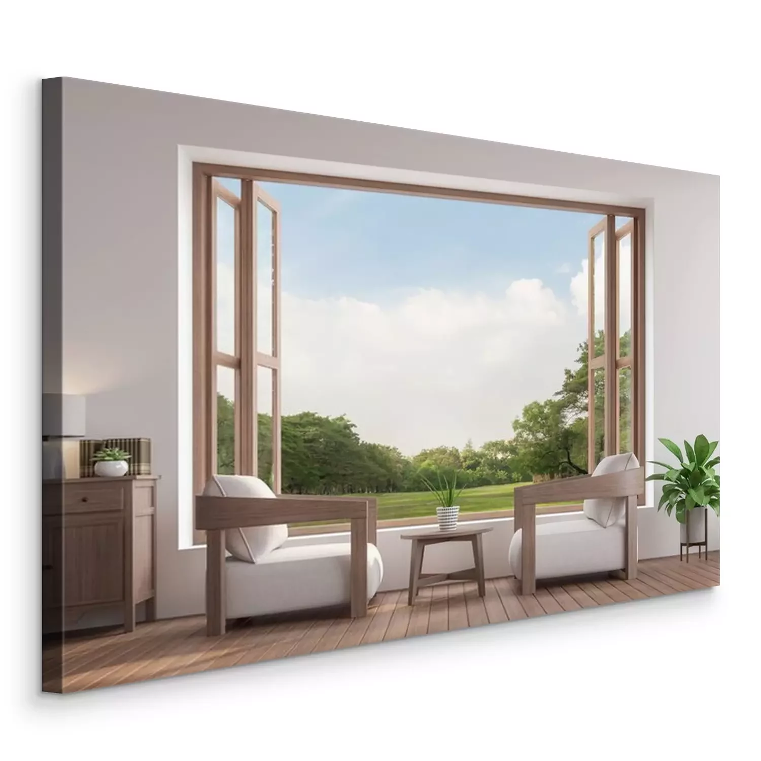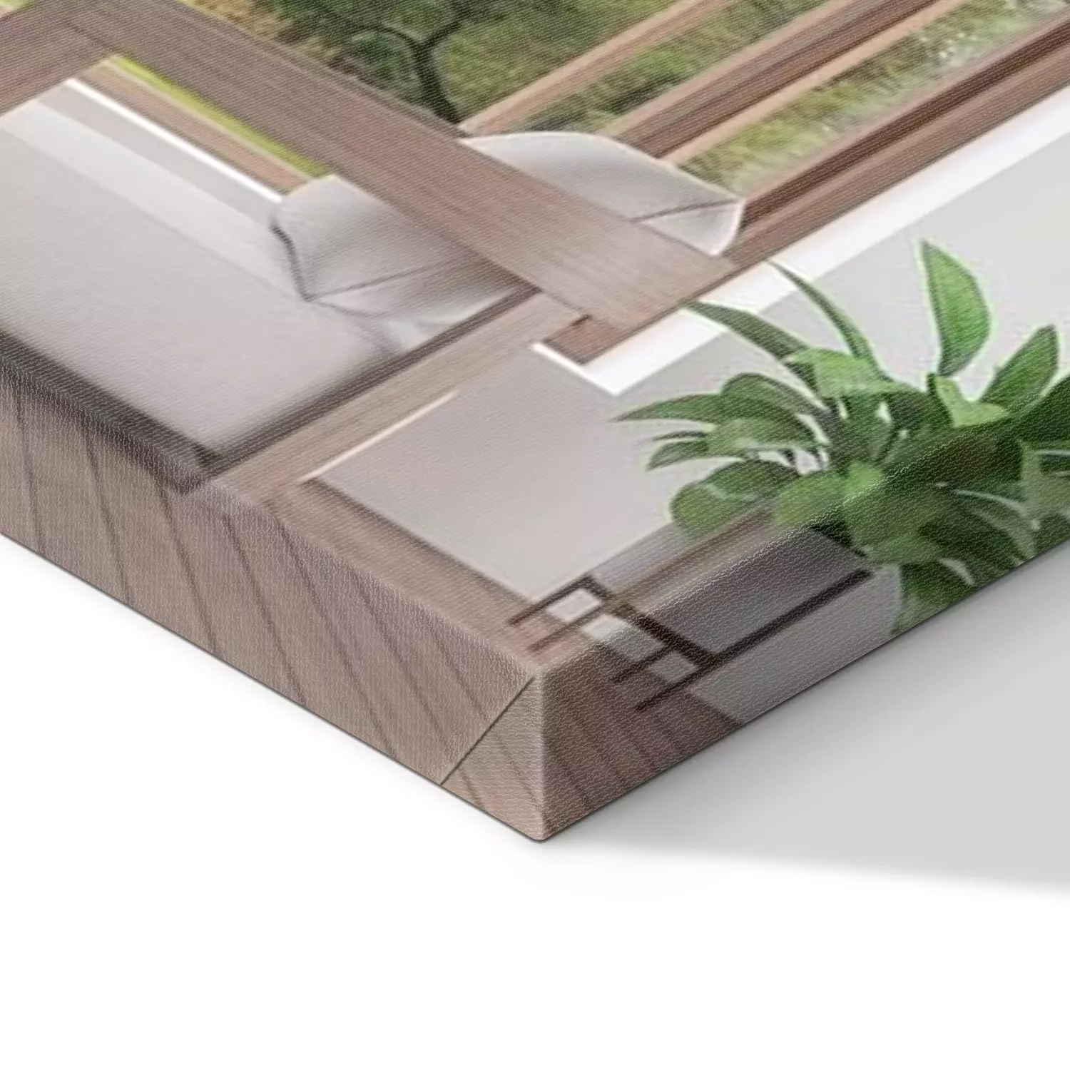 Tableau  Salon moderne contemporain avec rendu 3d, planchers en bois, tissus et meubles en bois, grande fenêtre ouverte donnant sur le jardin.