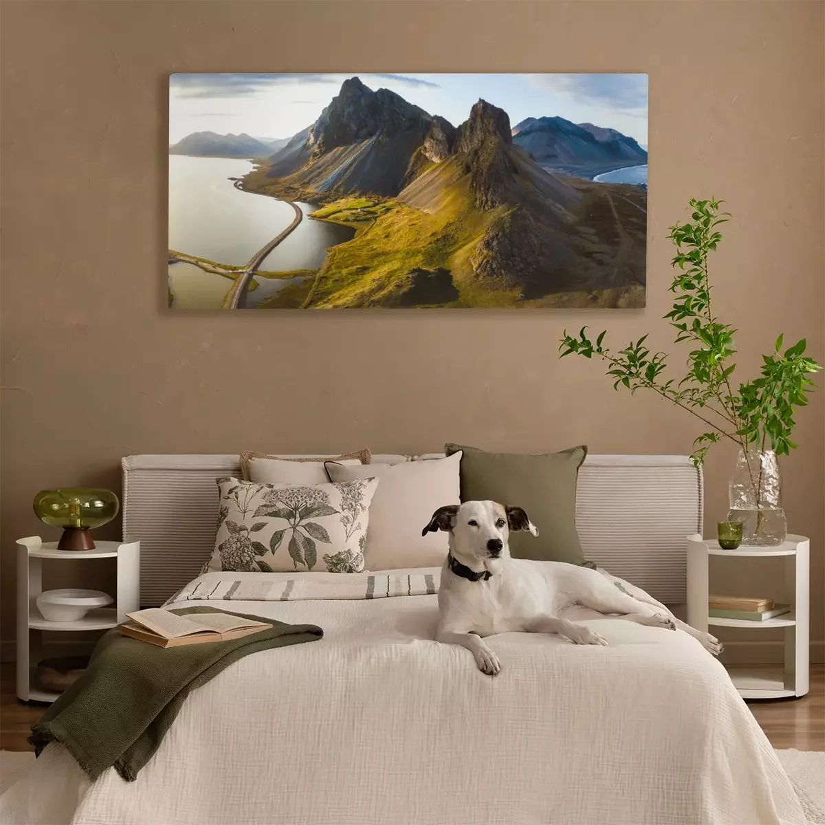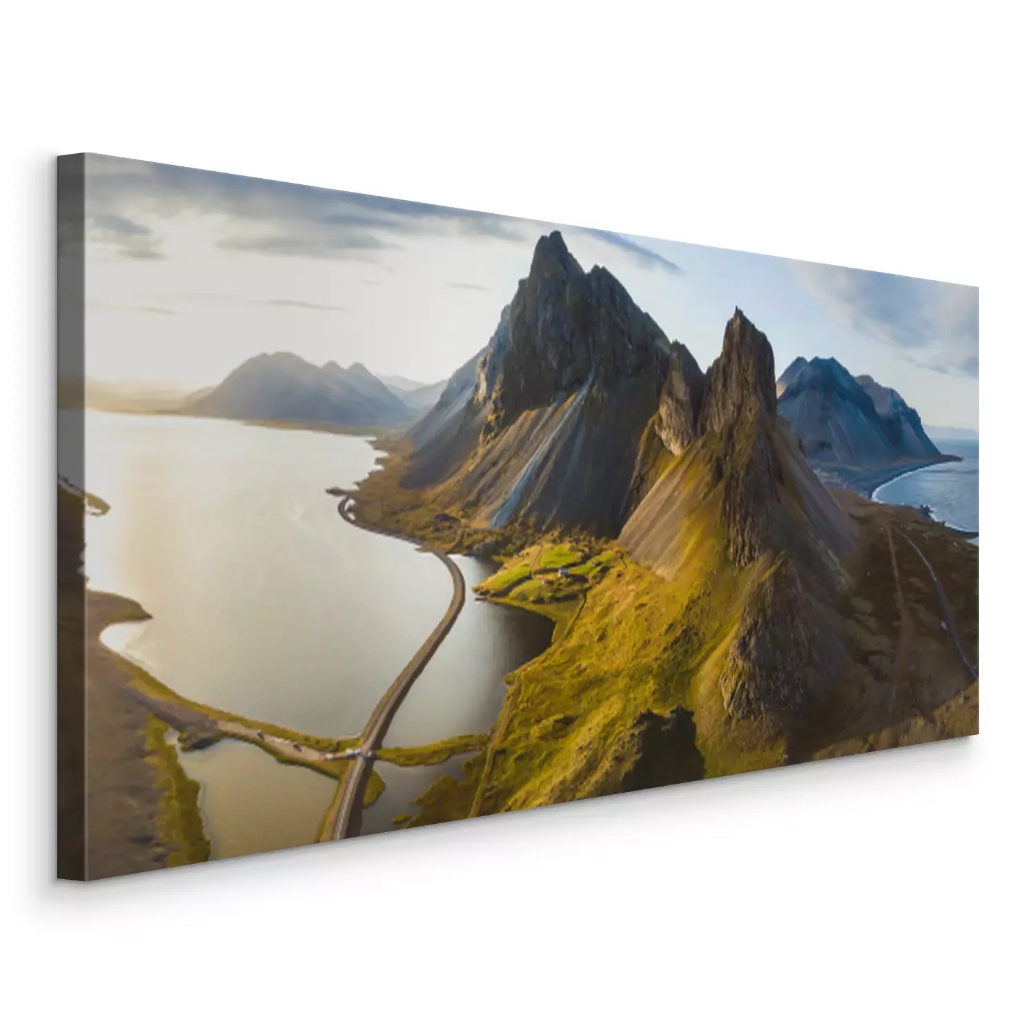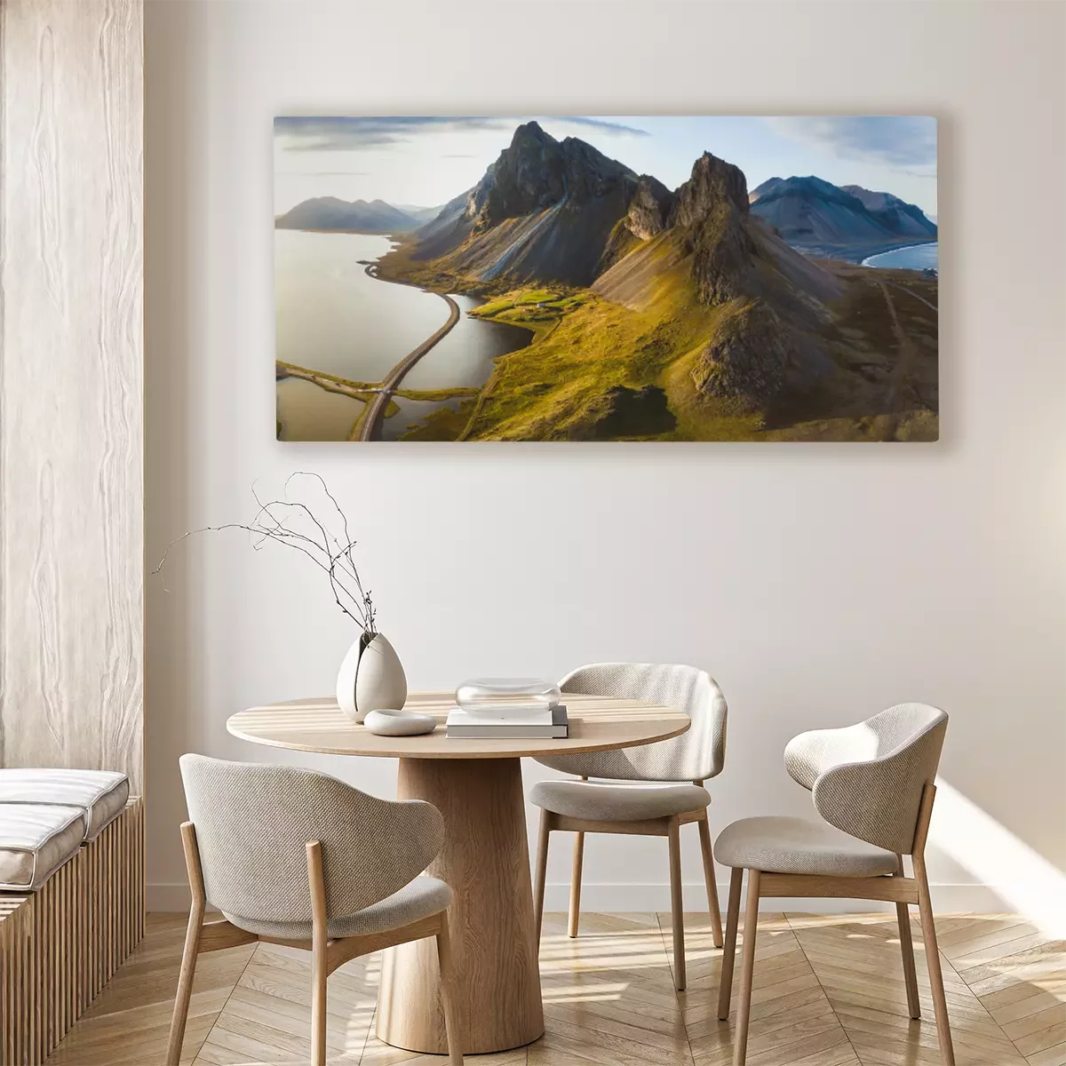 Tableau  scenic road in Iceland, beautiful nature landscape aerial panorama, mountains and coast at sunset