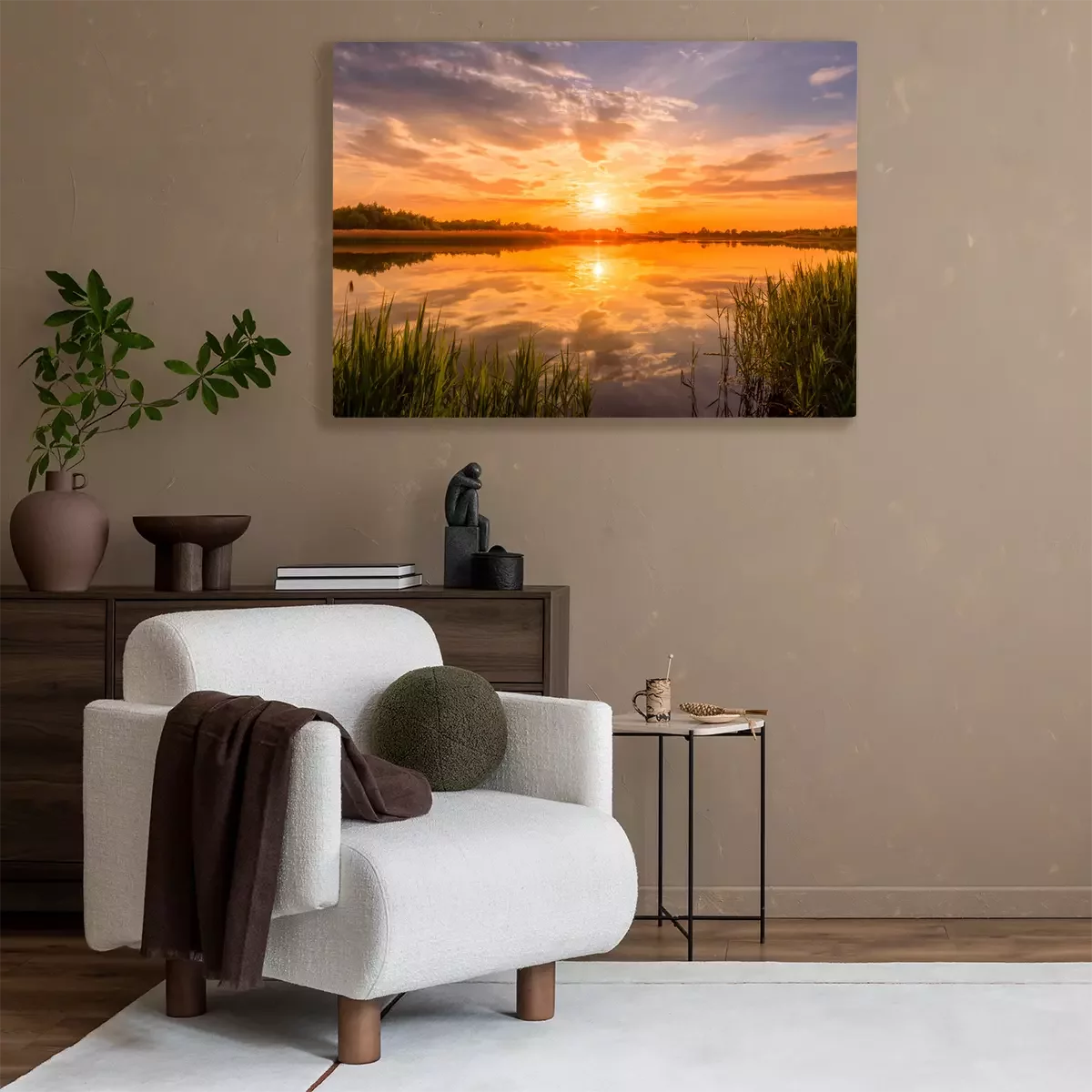 Tableau  Scenic view of beautiful sunrise or dawn above the pond or lake at spring or early summer morning with cloudy sky background, fog over water and reed grass with dew at foreground. Landscape. Water ref