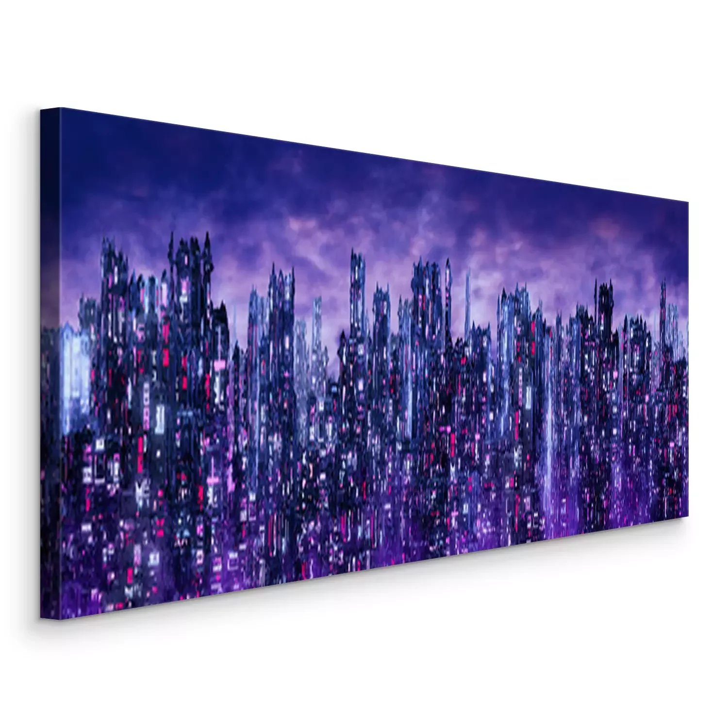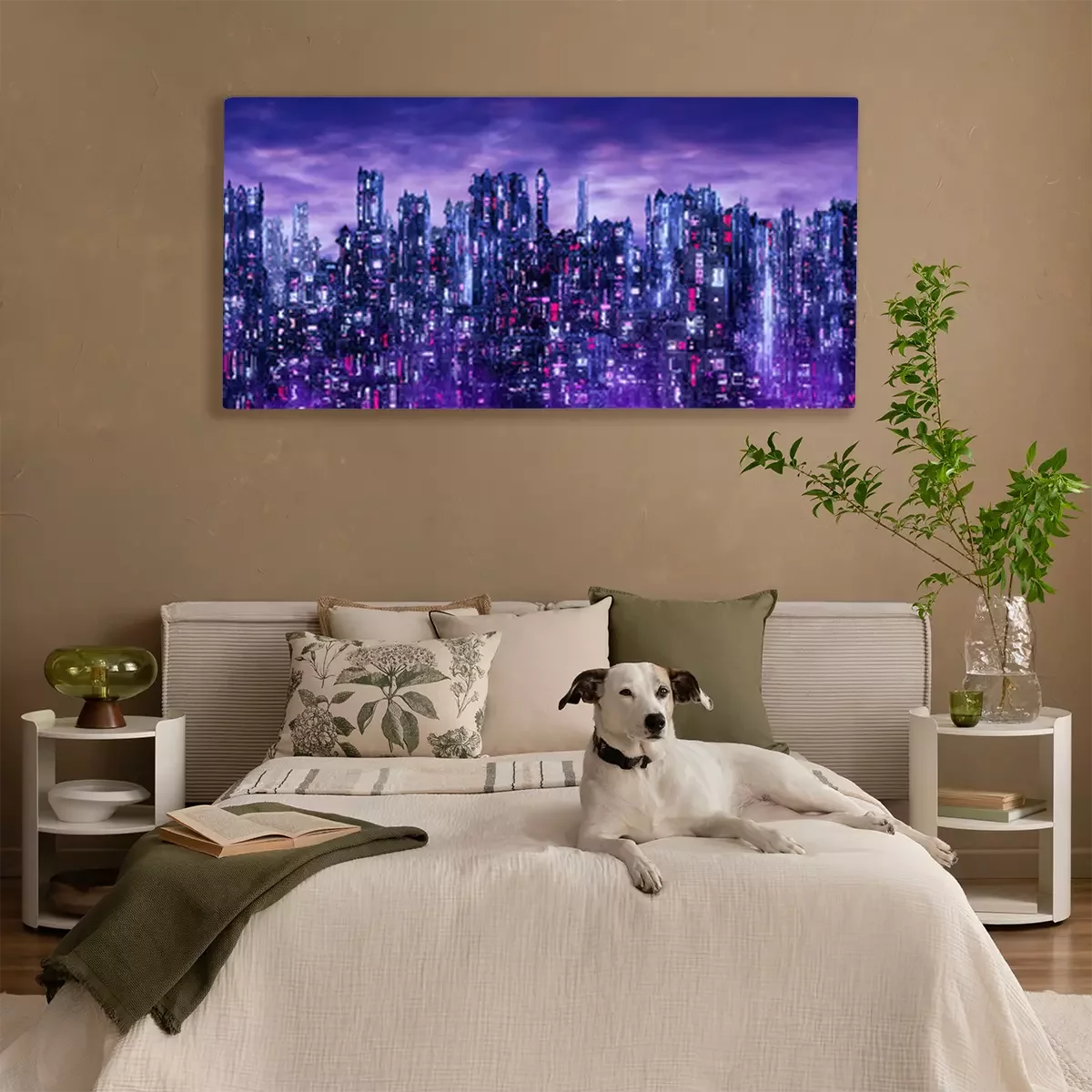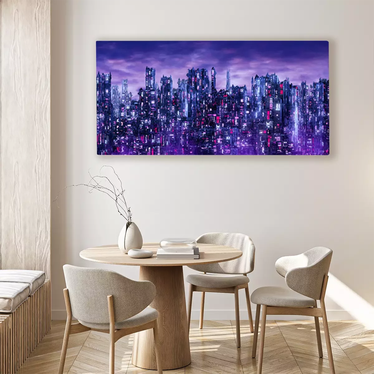 Tableau  Science fiction neon city night panorama / 3D illustration of dark futuristic sci-fi city lit with blight neon lights