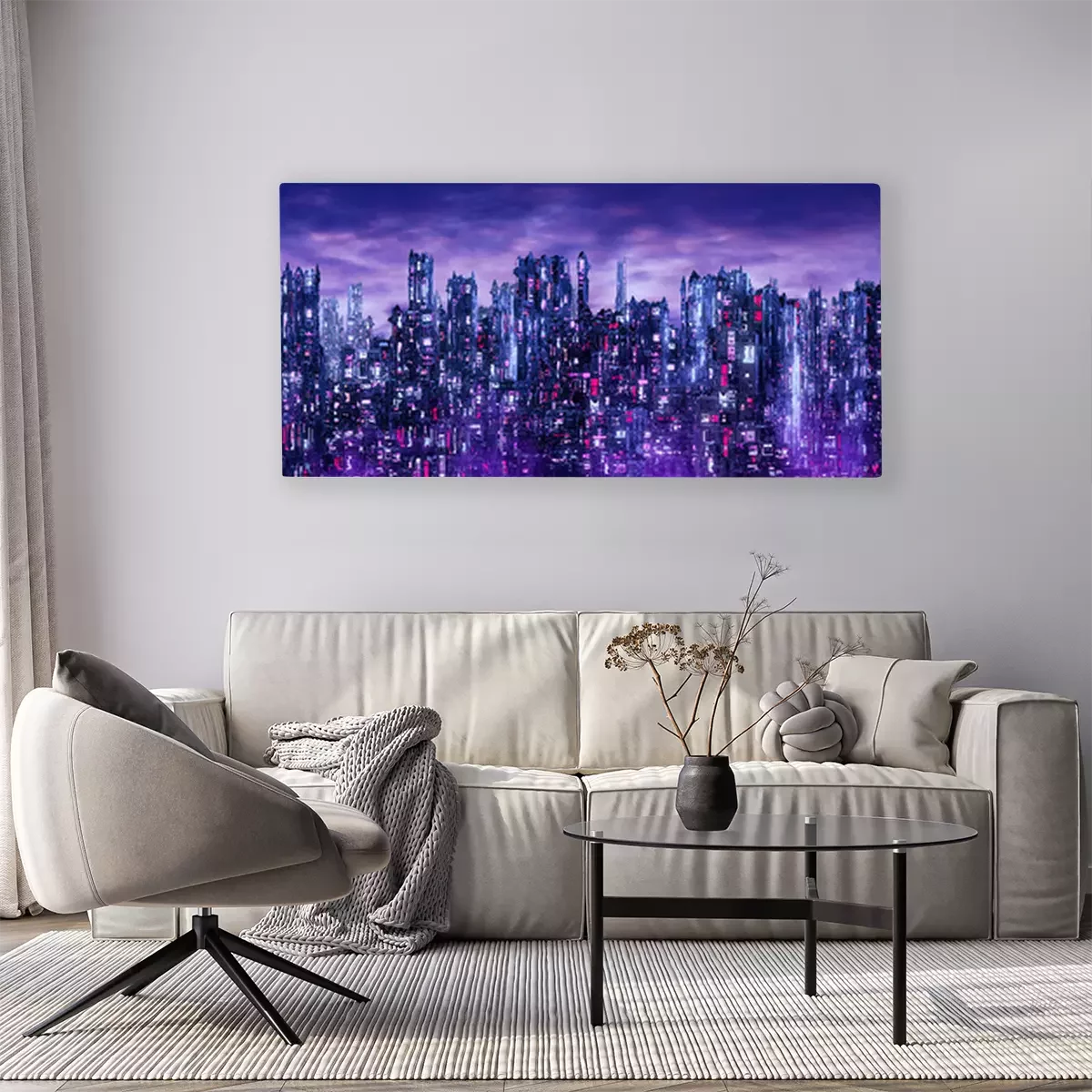 Tableau : Science fiction neon city night panorama / 3D illustration of dark futuristic sci-fi city lit with blight neon lights