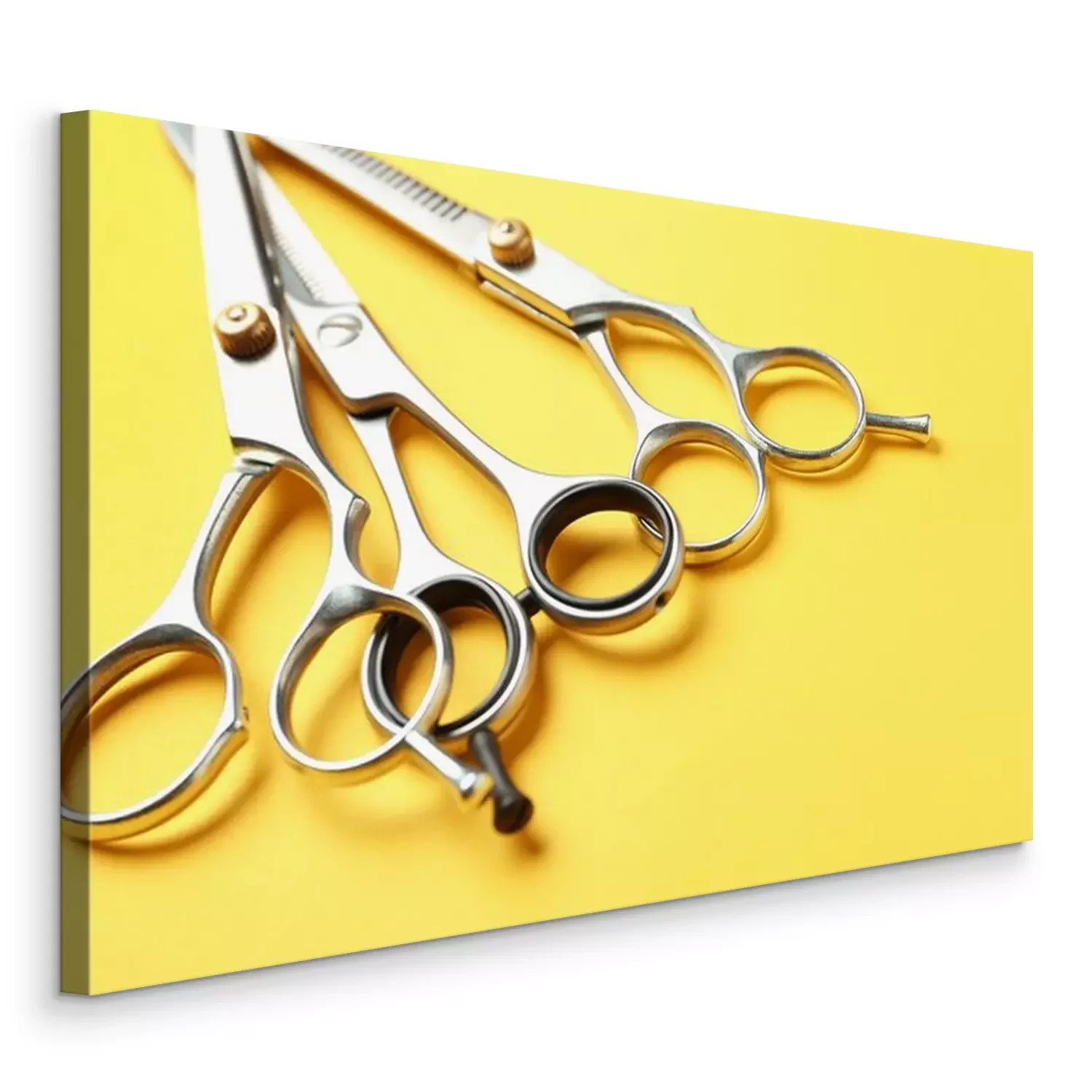 Tableau : Scissors and space for text on color background, closeup. Hairdresser tools