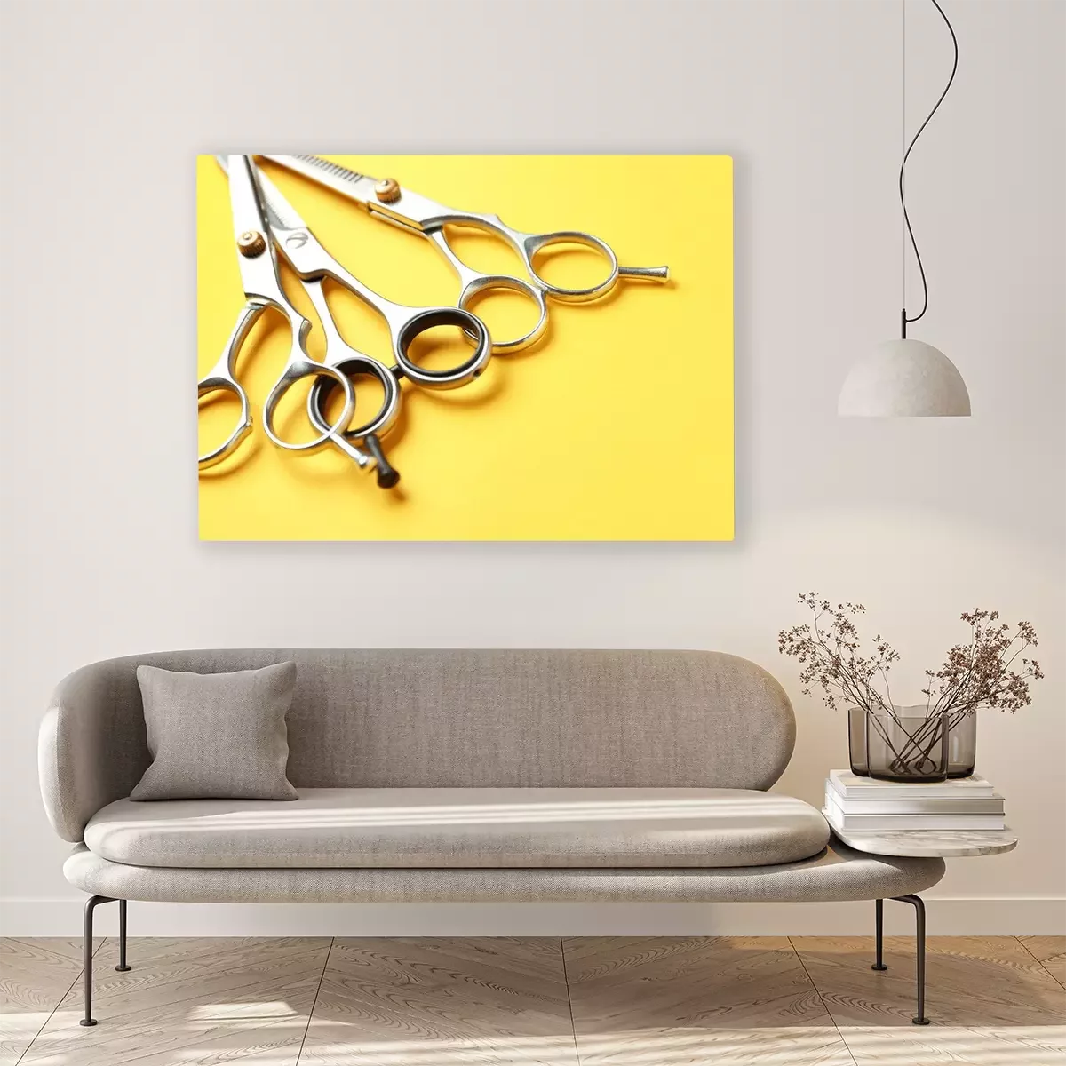 Tableau  Scissors and space for text on color background, closeup. Hairdresser tools