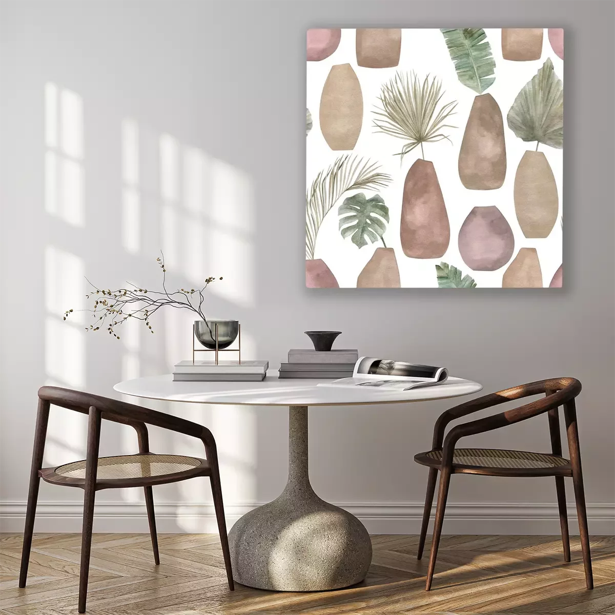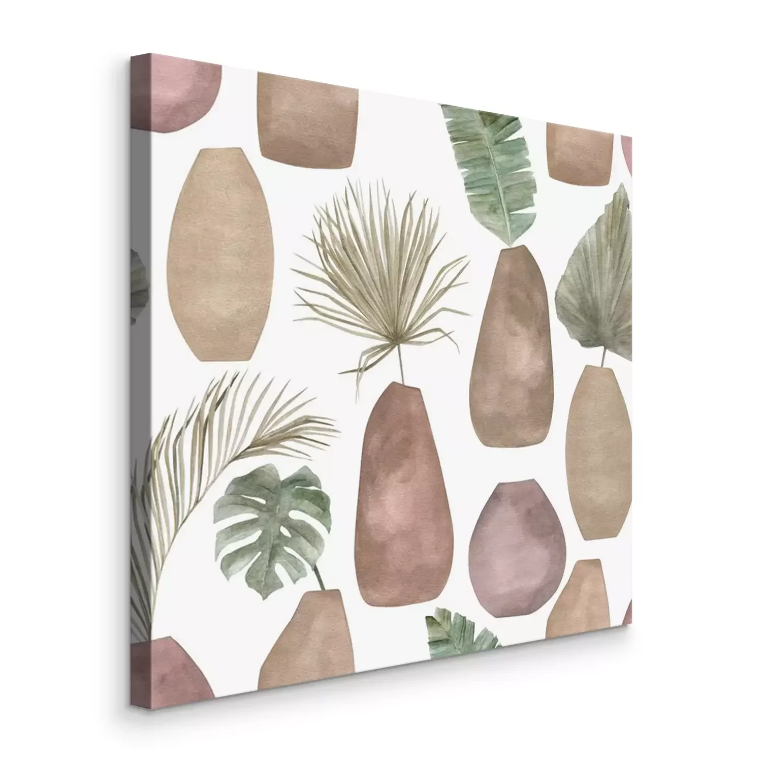 Tableau : Seamless pattern with abstract botanical compositions with vase. Trendy watercolor print with elements of exotic palm leaves on white background. Modern minimalist art.