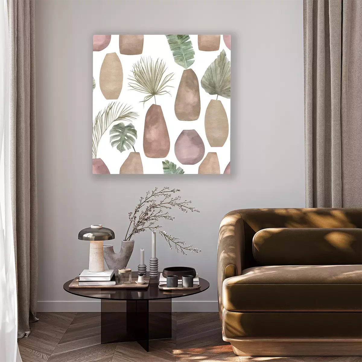 Tableau  Seamless pattern with abstract botanical compositions with vase.  Trendy watercolor print with elements of exotic palm leaves on white background. Modern minimalist art.