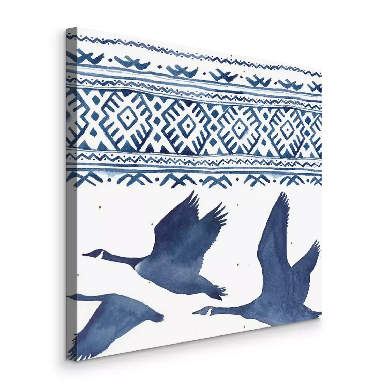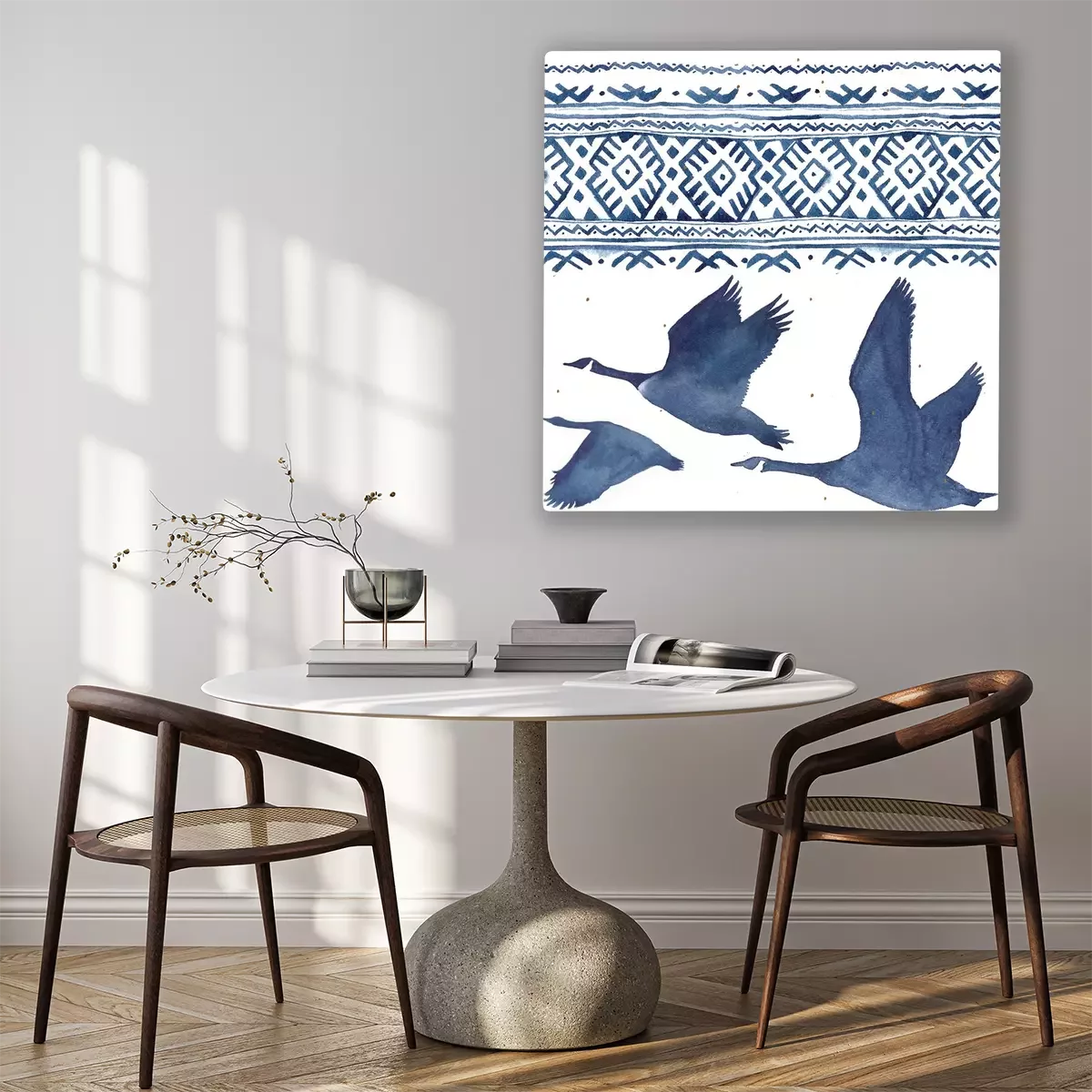 Tableau : Seamless pattern with watercolor realistic a flock of geese silhouette and national ornament in blue colors