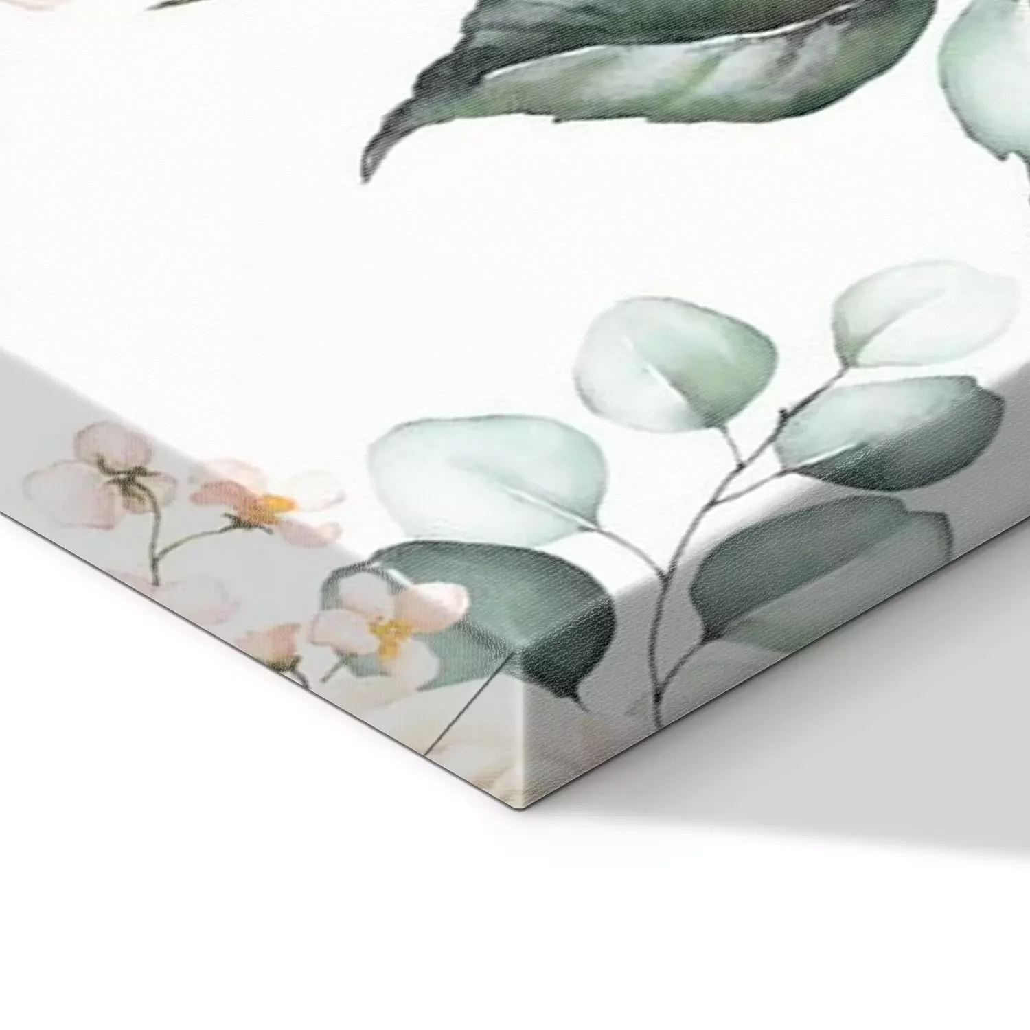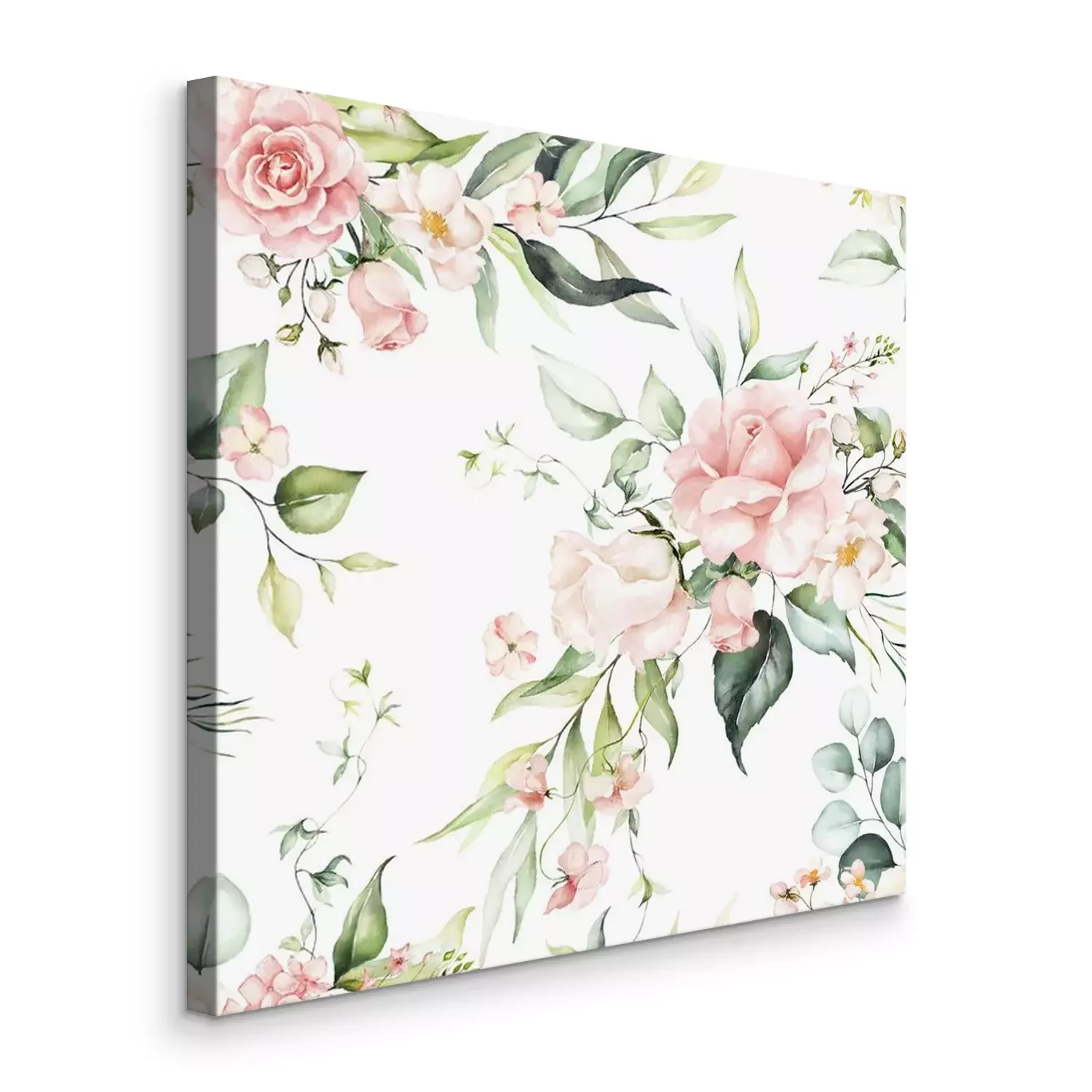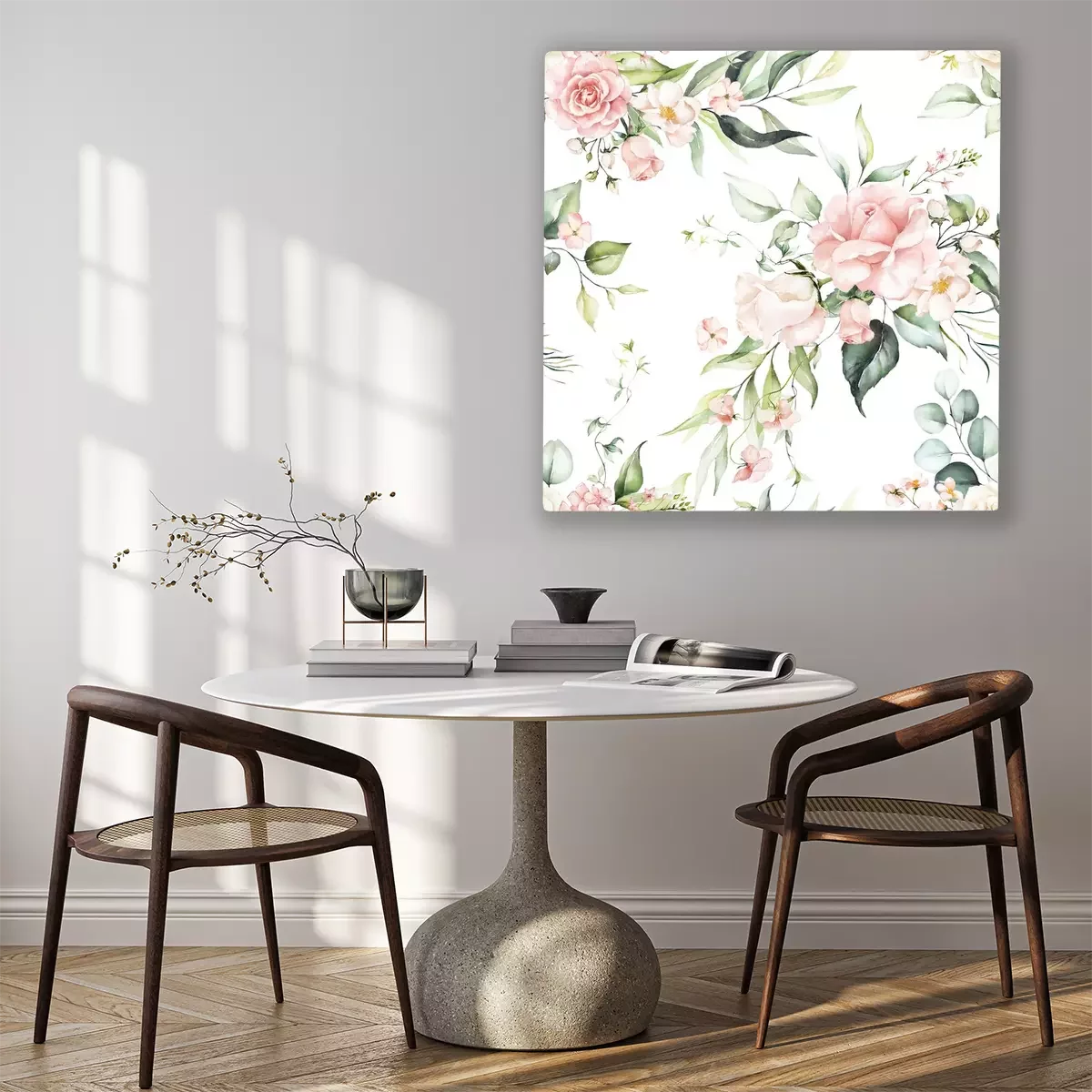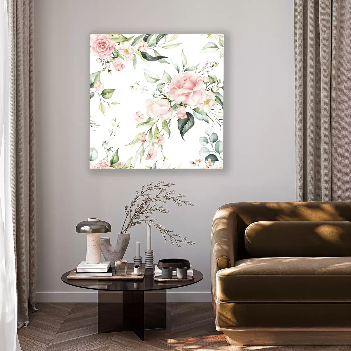 Tableau  Seamless watercolor floral pattern - pink flowers, green leaves & branches on white background; for wrappers, wallpapers, postcards, greeting cards, wedding invitations, romantic events.