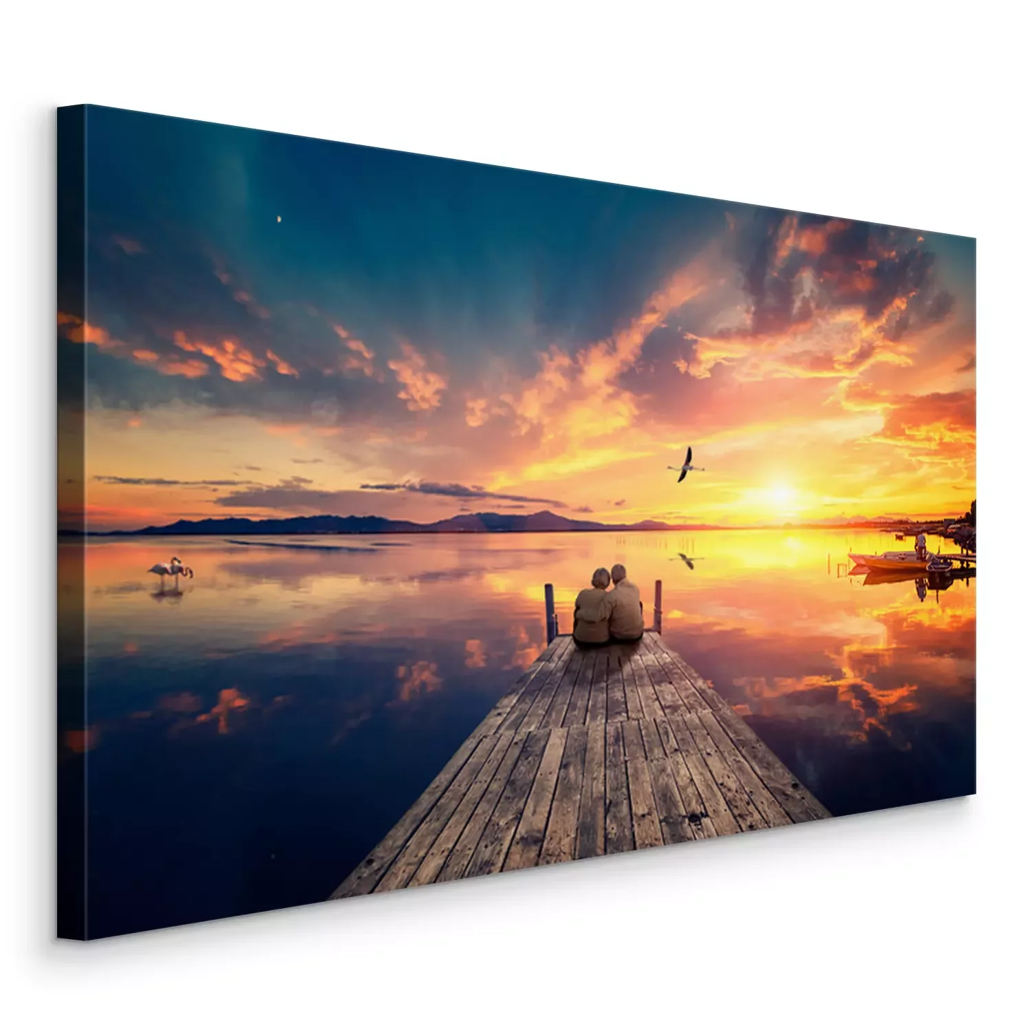 Tableau  Senior couple seated on a wooden jetty, looking a colorful sunset on the sea with a flying flamingo reflected on the calm water.