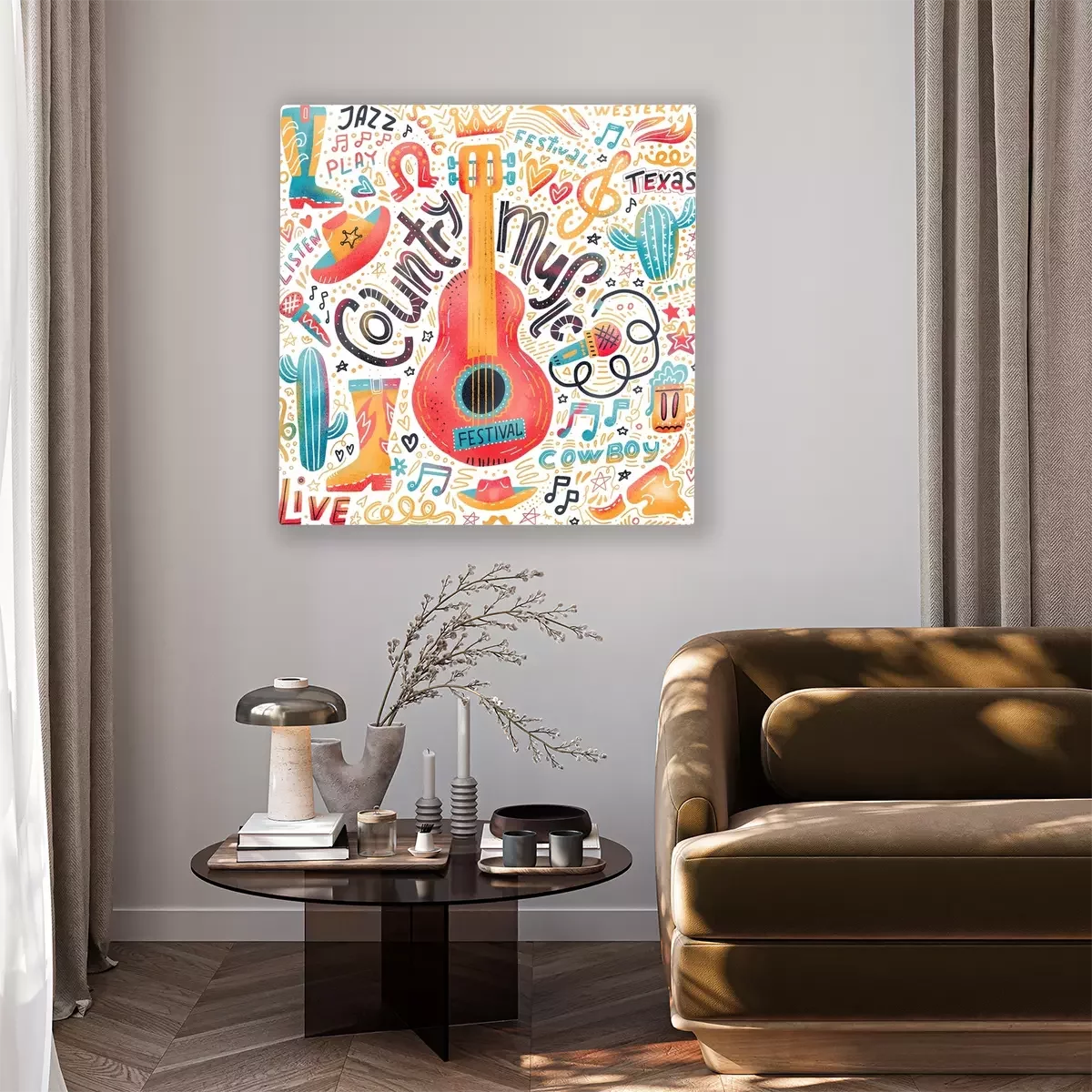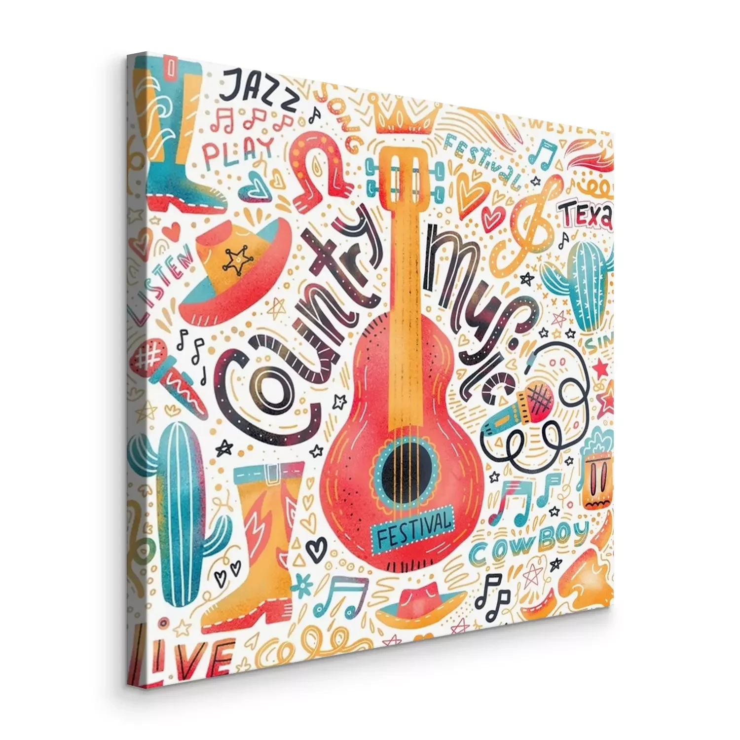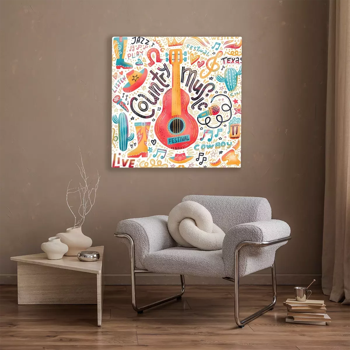 Country music print concept for postcards or festival banners. hand drawn illustration in textured flat doodle style. Guitar with written lettering.