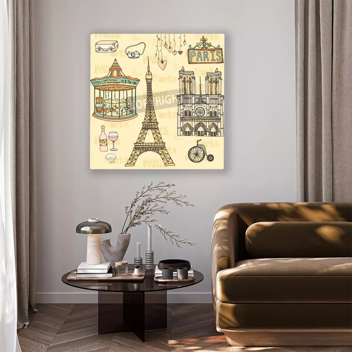 Tableau  Set of Paris symbols made in vector. Eiffel tower, moulin rouge, Notre Dame De Paris, wine, cheese.