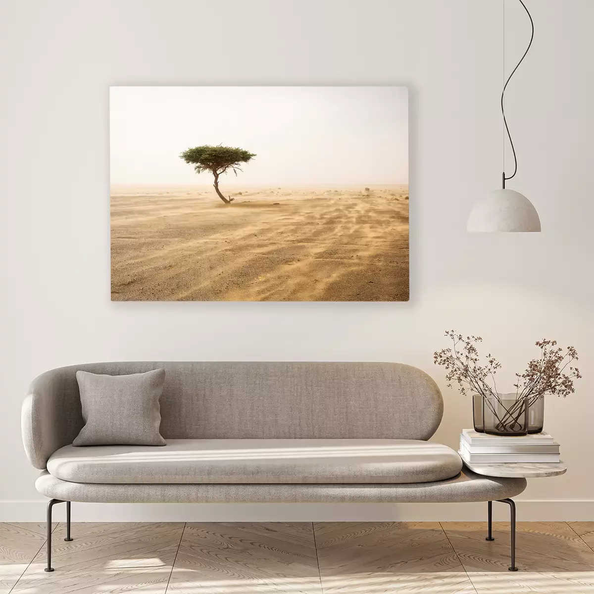 Tableau : Seul arbre au milieu du désert du Sahara avec tempête de sable
