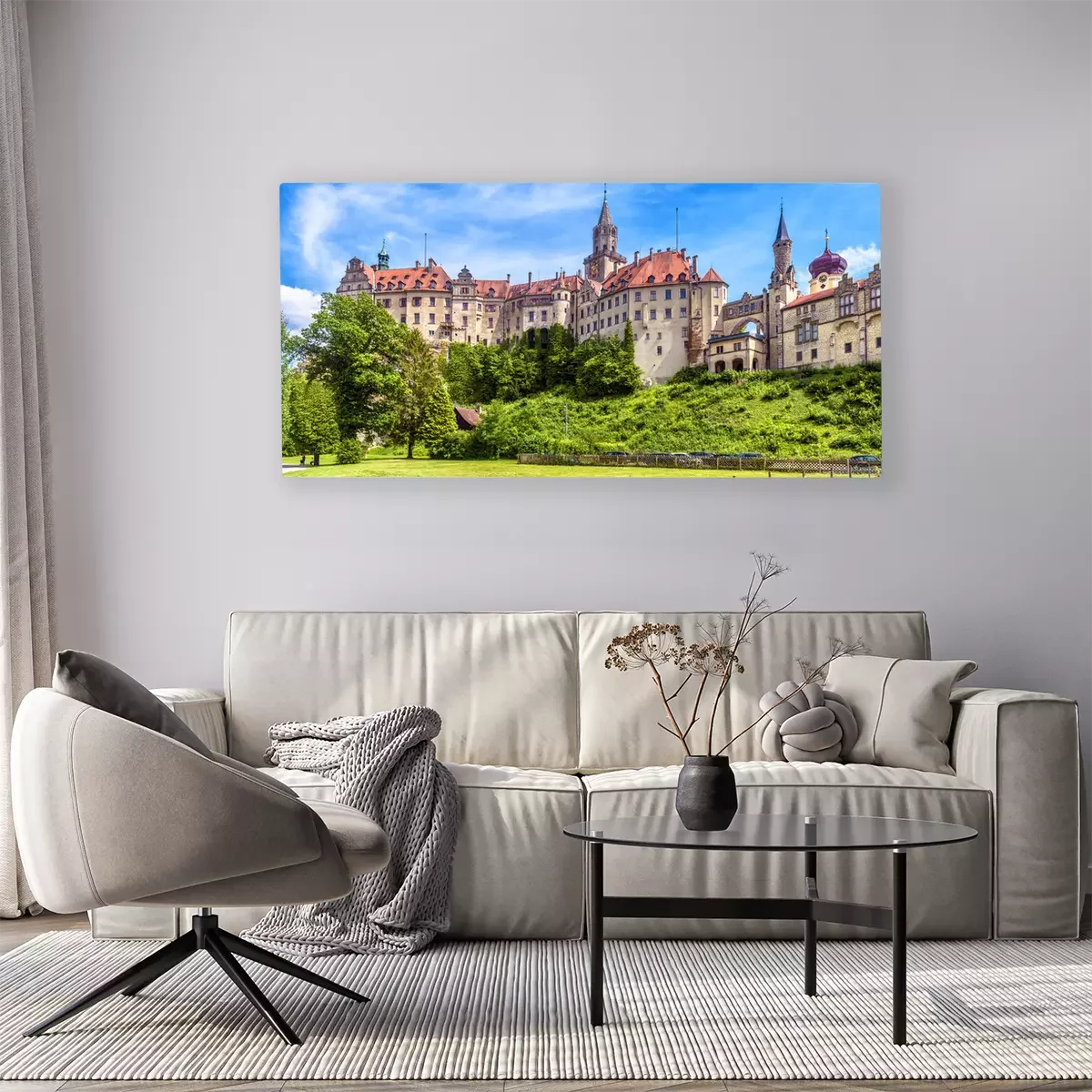 Tableau : Sigmaringen Castle in summer, Germany. This famous Gothic castle is a landmark of Baden-Wurttemberg. Panorama of old German castle on a hill. Scenic view of beautiful medieval palace on sunny day.