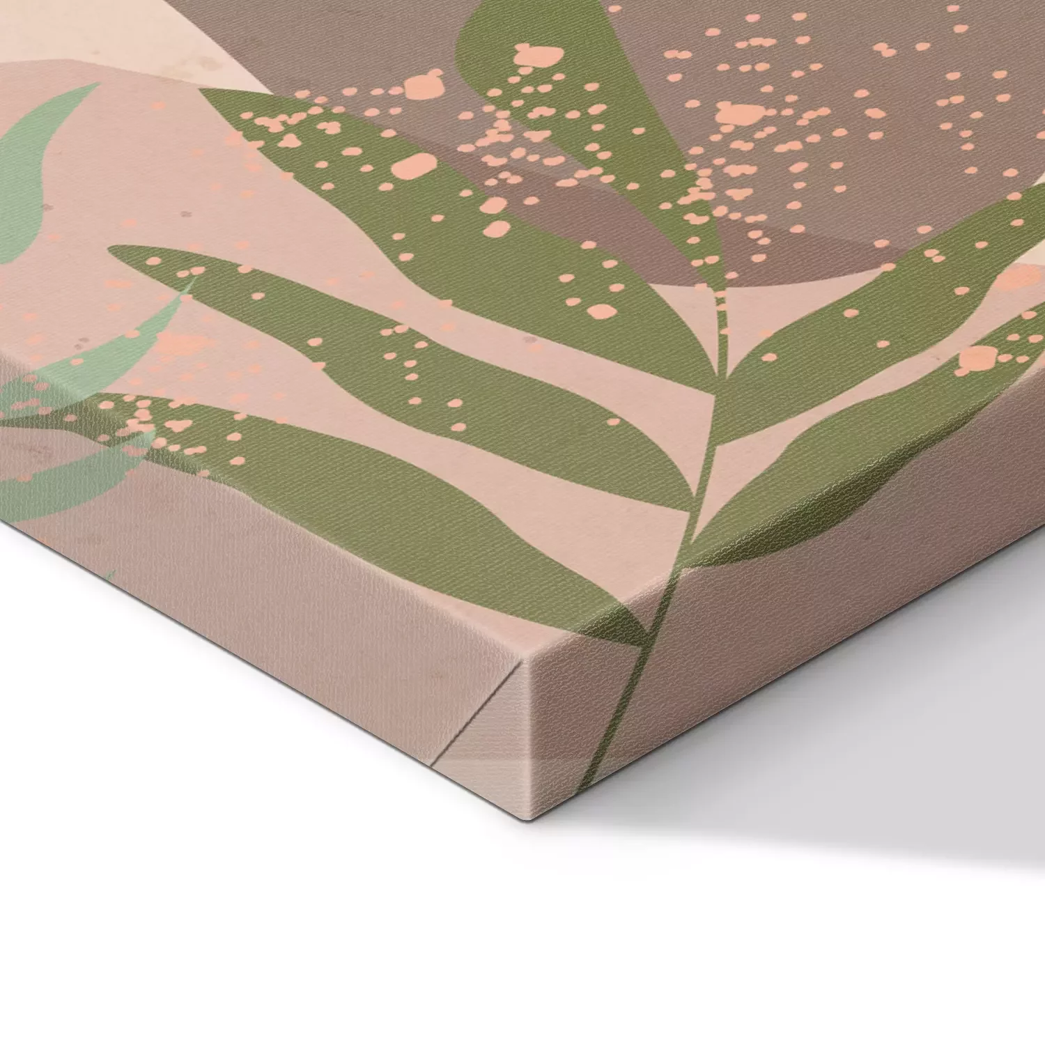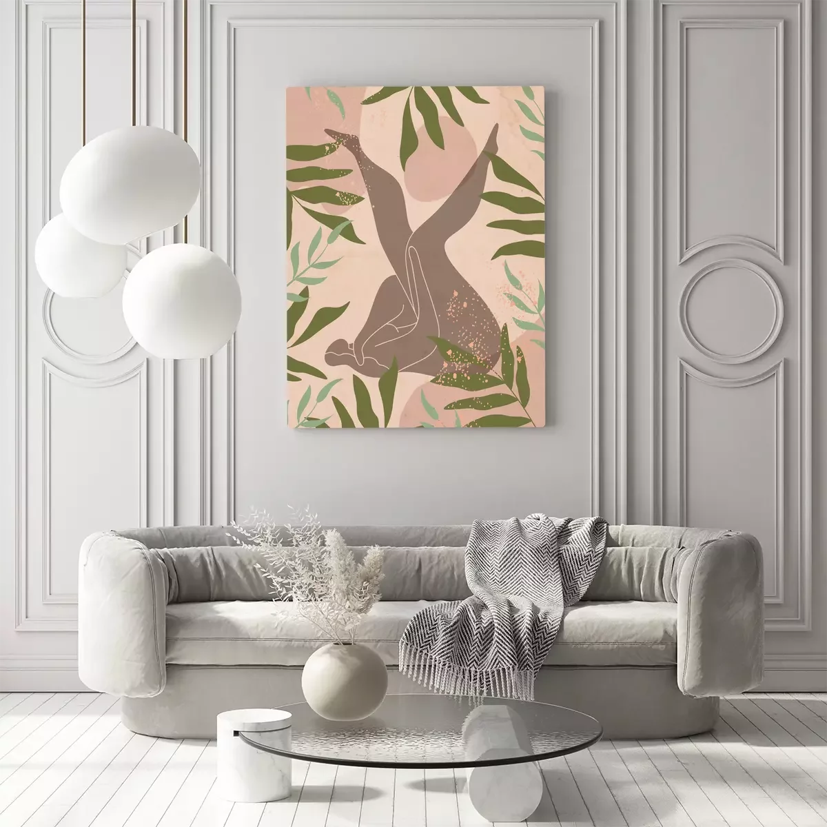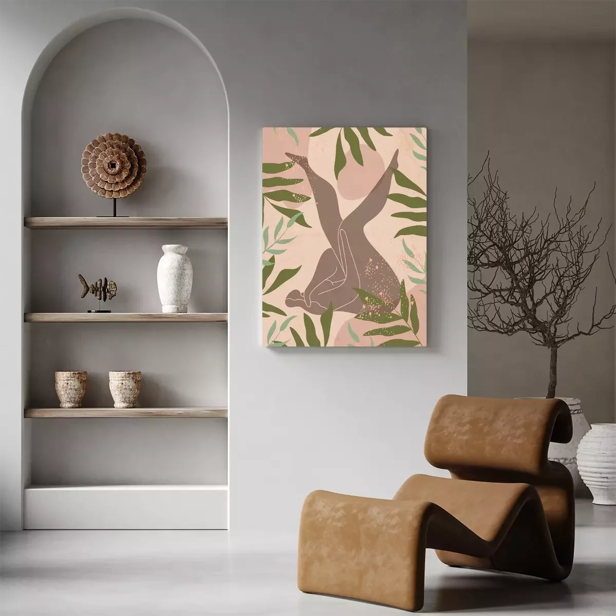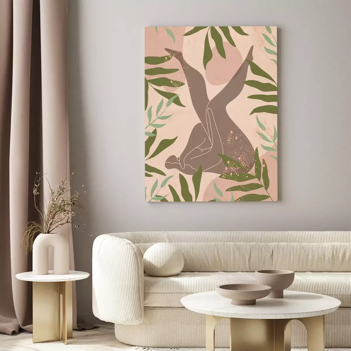 Silhouette abstraite d'une femme sur fond beige avec des feuilles.
