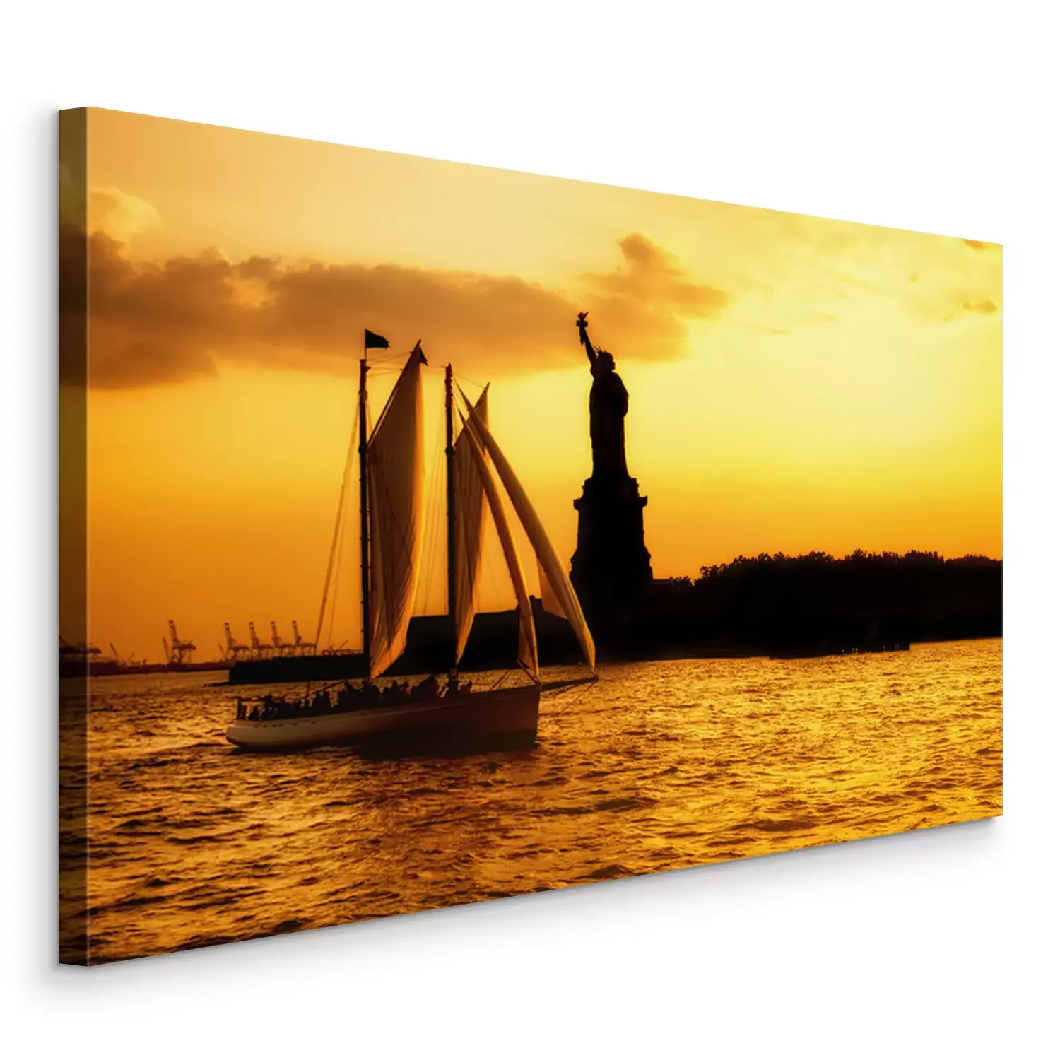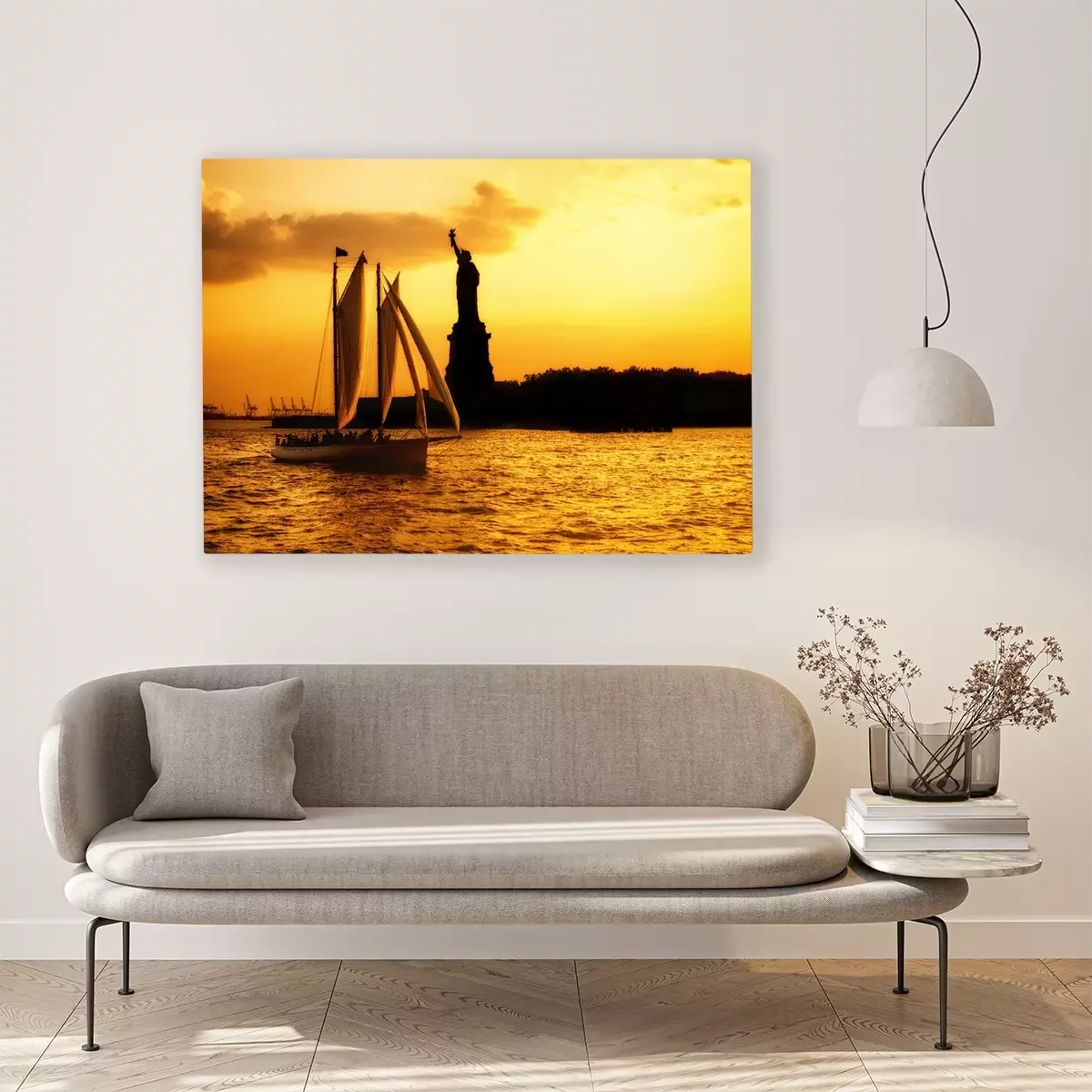 Tableau  Silhouette, statue, liberté, voilier, Coucher soleil