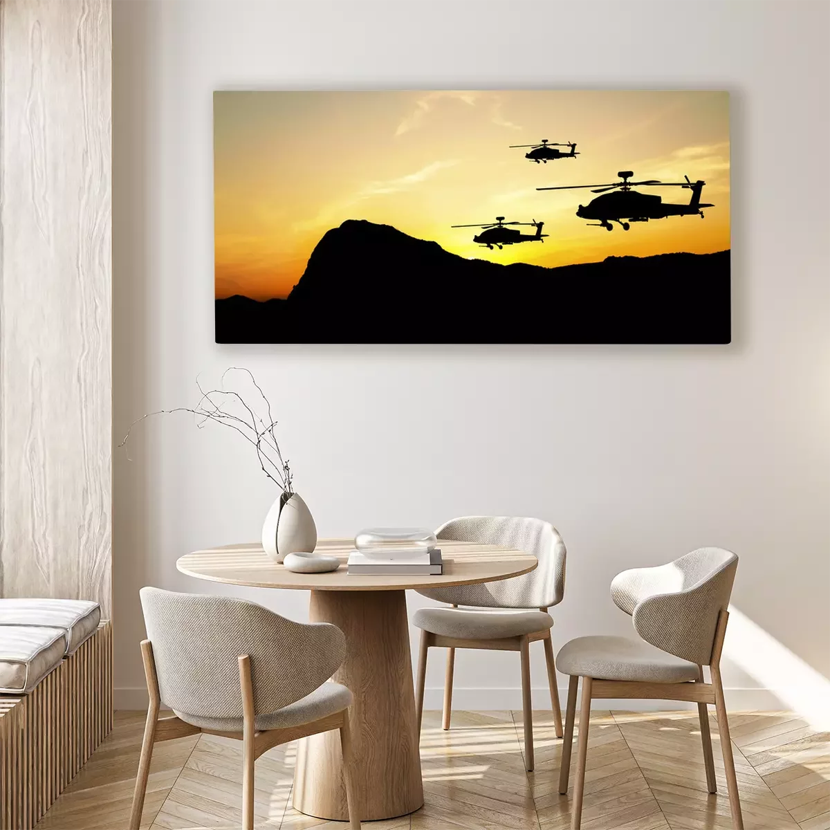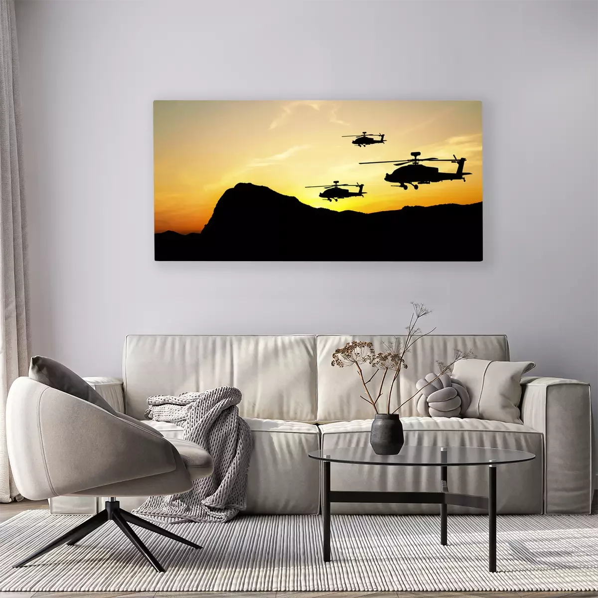 Tableau  silhouettes d'hélicoptères sur fond coucher de soleil