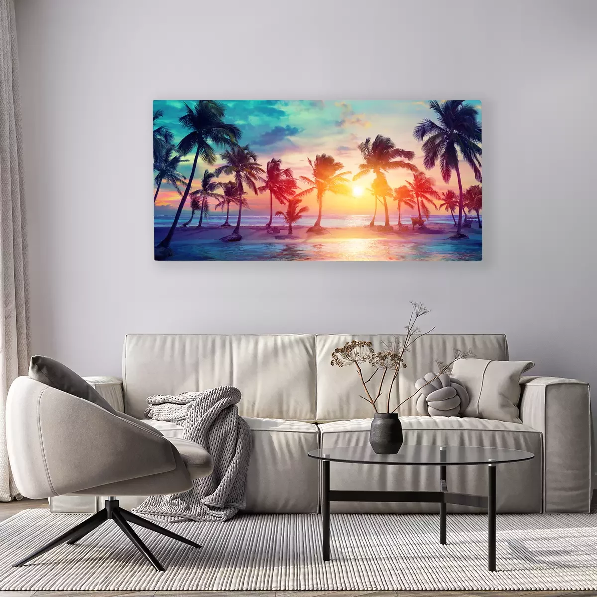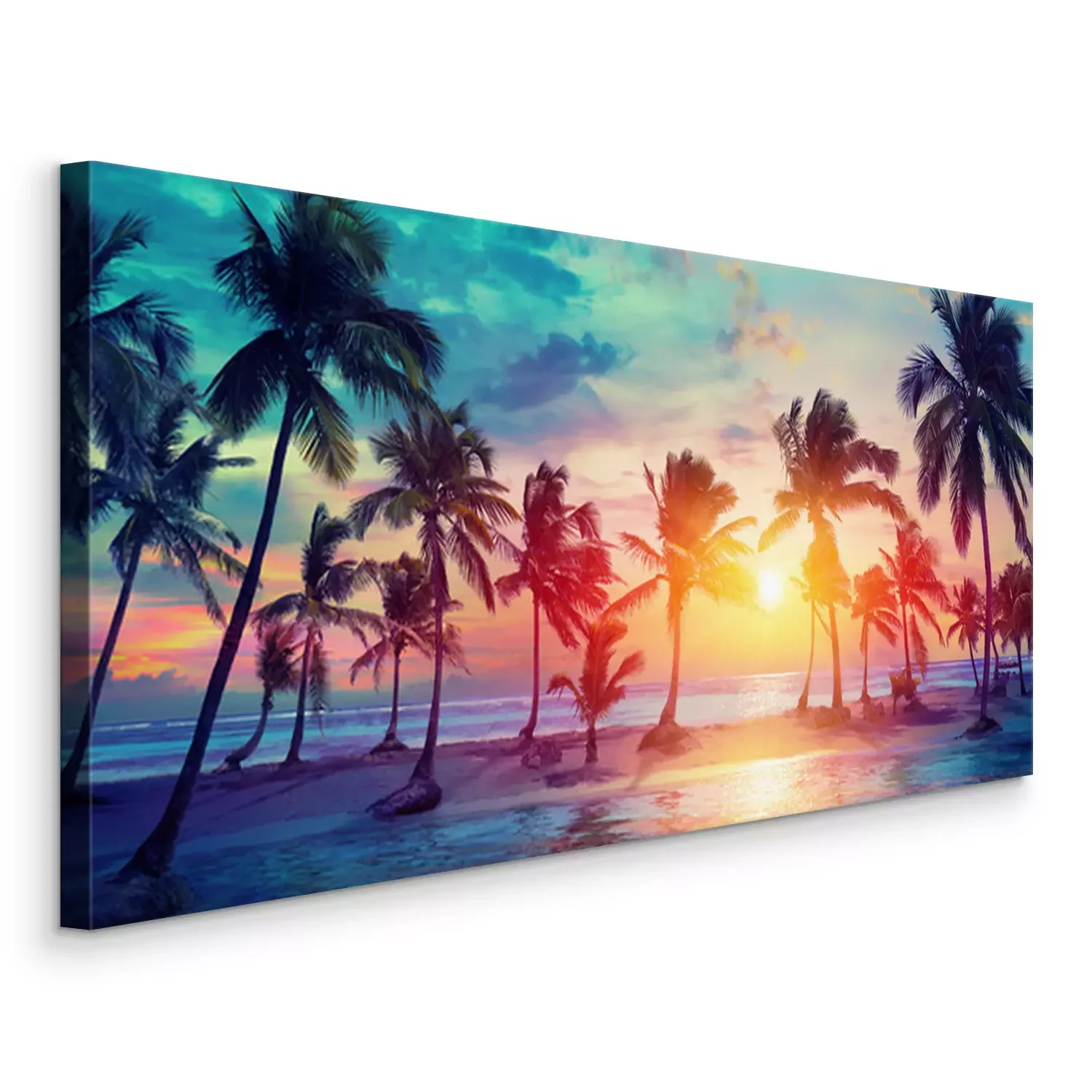 Tableau : Silhouettes de palmiers sur la plage tropicale au coucher du soleil - couleurs vintage modernes
