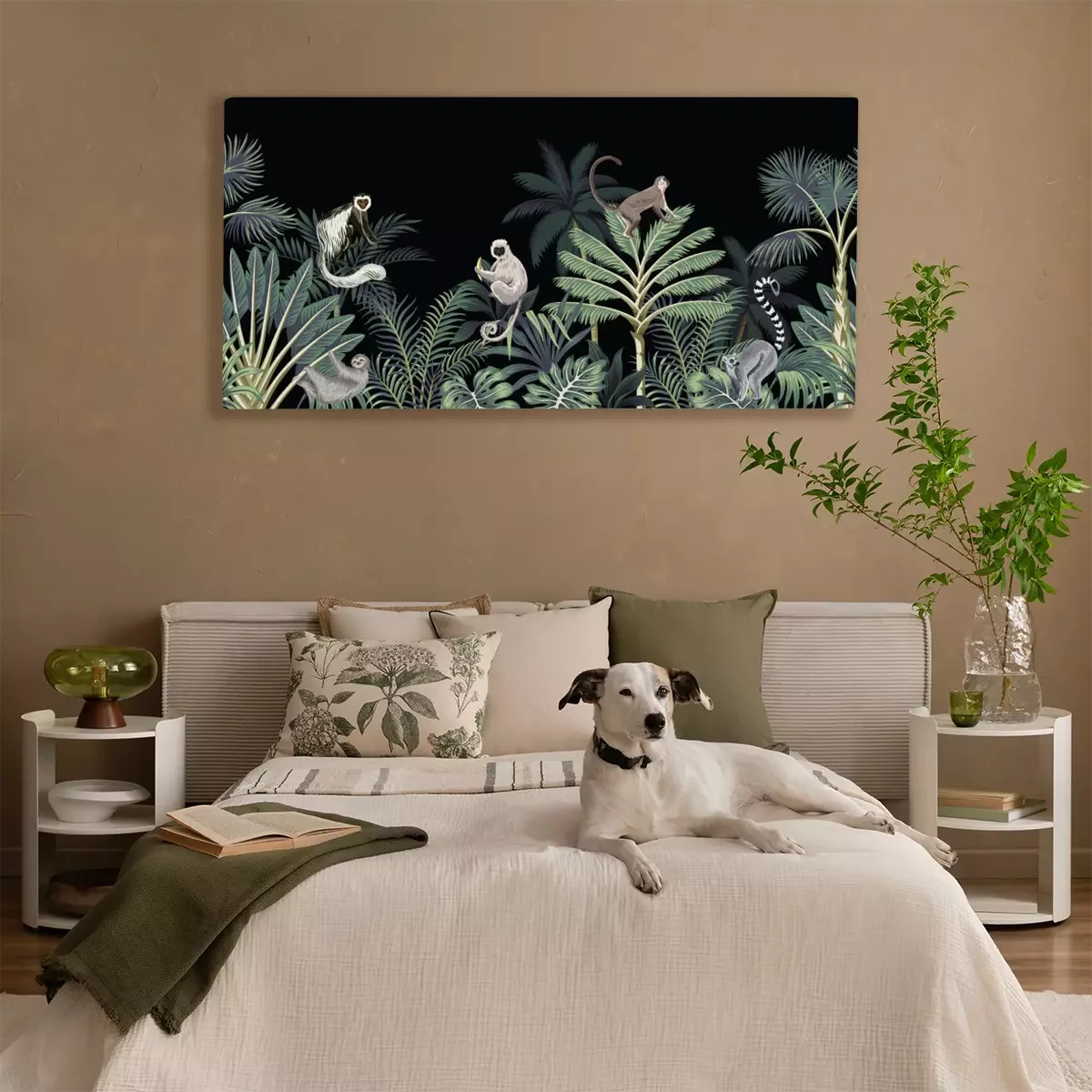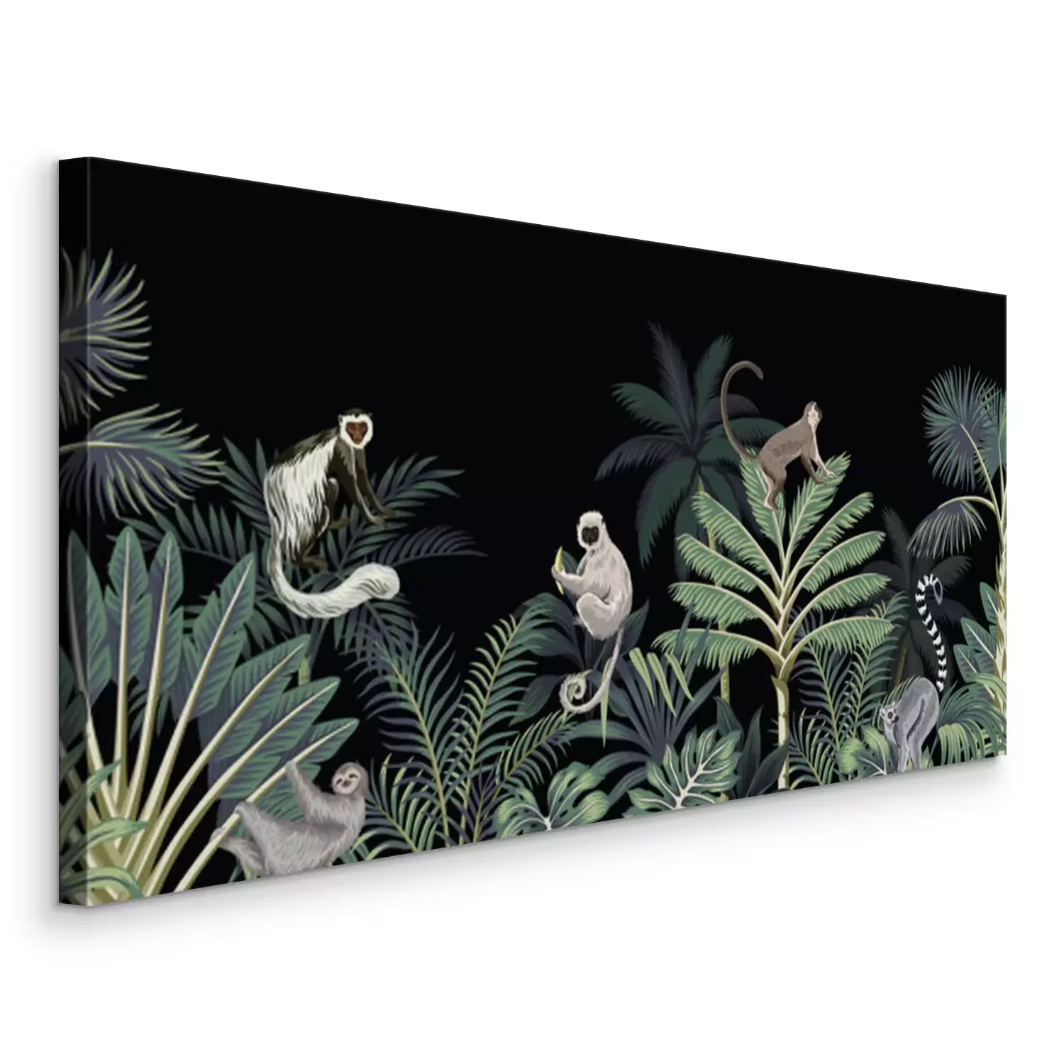 Tropical vintage monkey animal, hibiscus flower, peach fruit, palm leaves floral seamless pattern black background. Exotic jungle wallpaper.