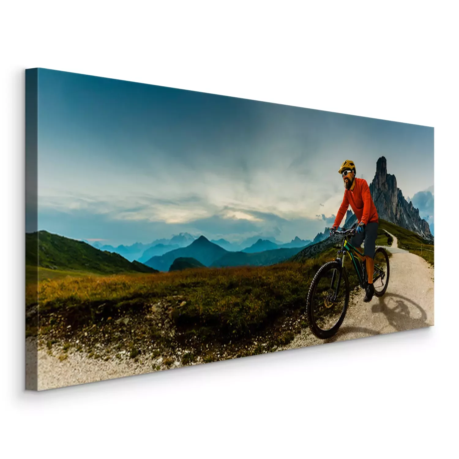 Tableau  Single mountain bike rider on electric bike, e-mountainbike rides up mountain trail. Man riding on bike in Dolomites mountains landscape. Cycling e-mtb enduro trail track. Outdoor sport activity.