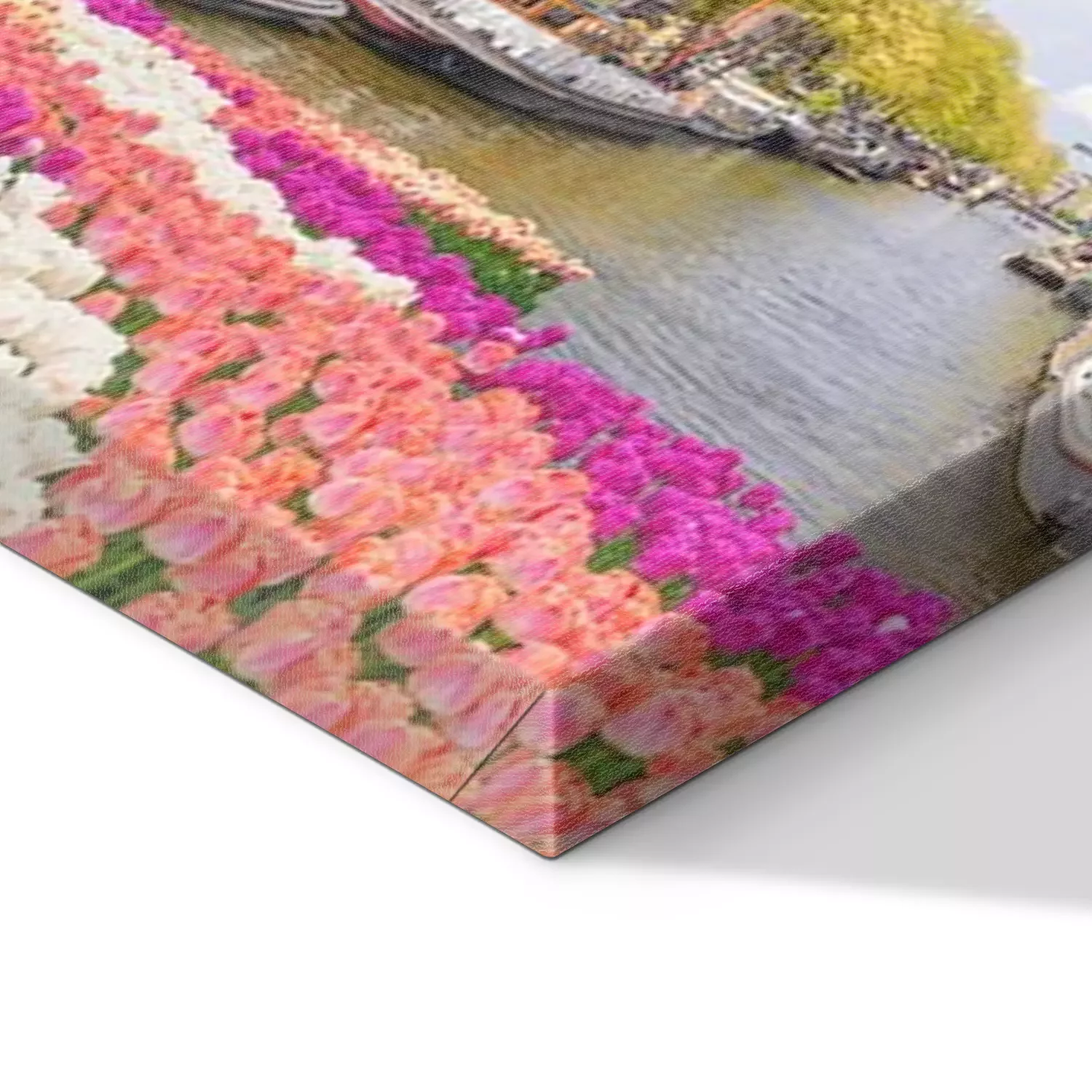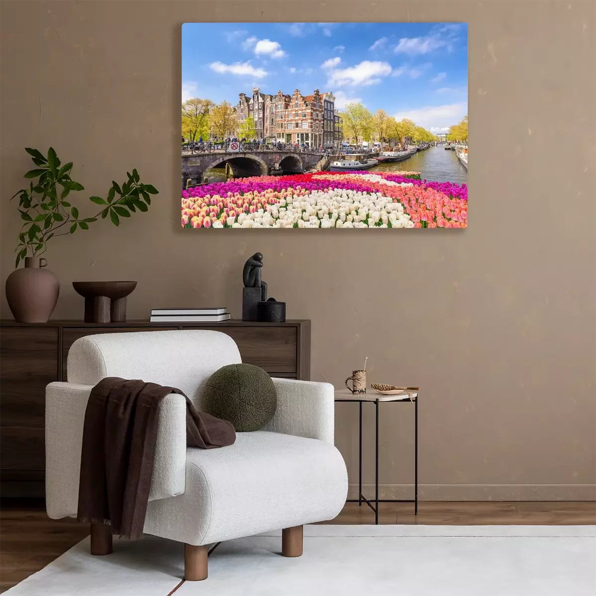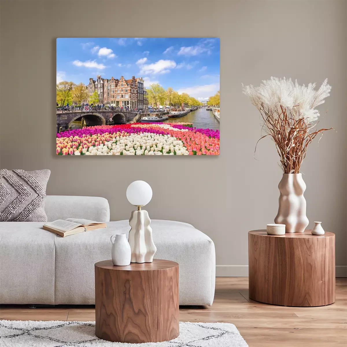 Tableau  Skyline de la ville d'Amsterdam au bord de l'eau du canal avec fleur de tulipe de printemps, Amsterdam, Pays-Bas