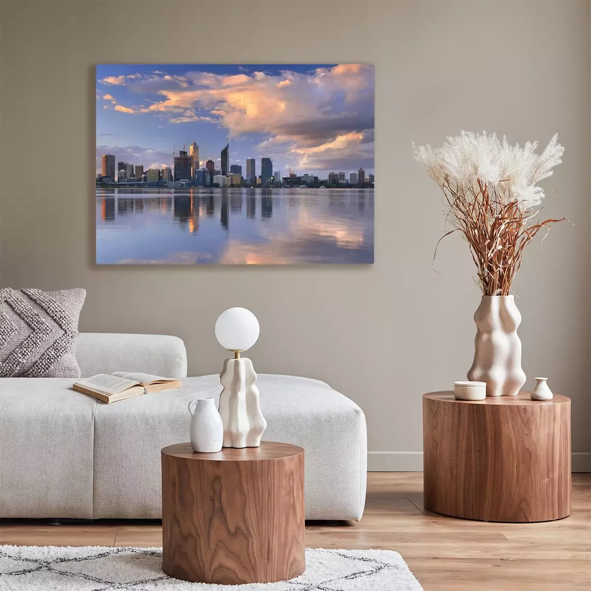 Tableau : Skyline de Perth, en Australie à travers la rivière Swan au coucher du soleil