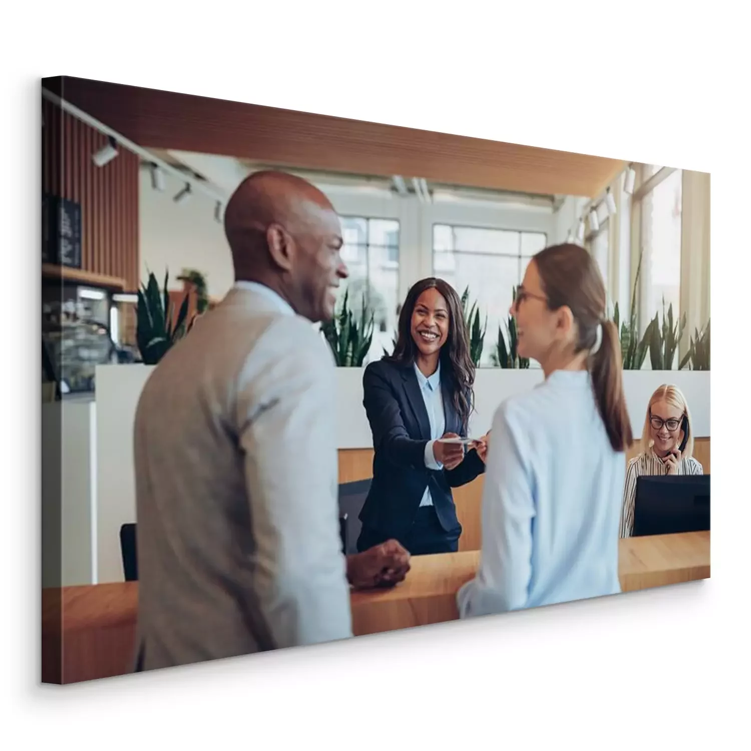 Tableau : Smiling concierge helping two guests check in to a hotel