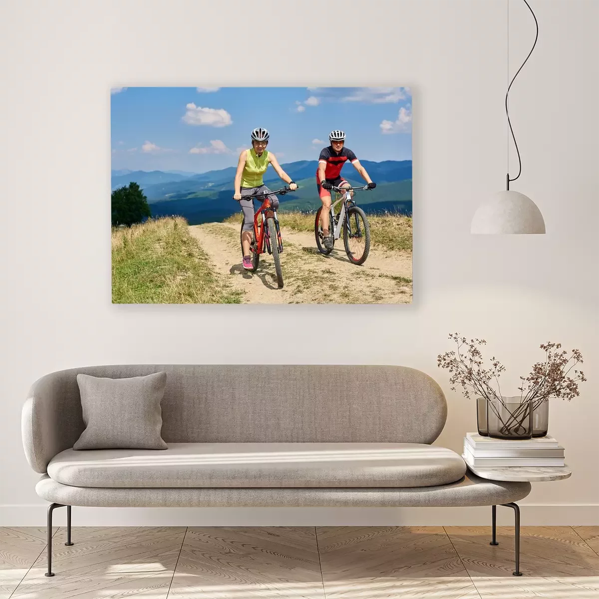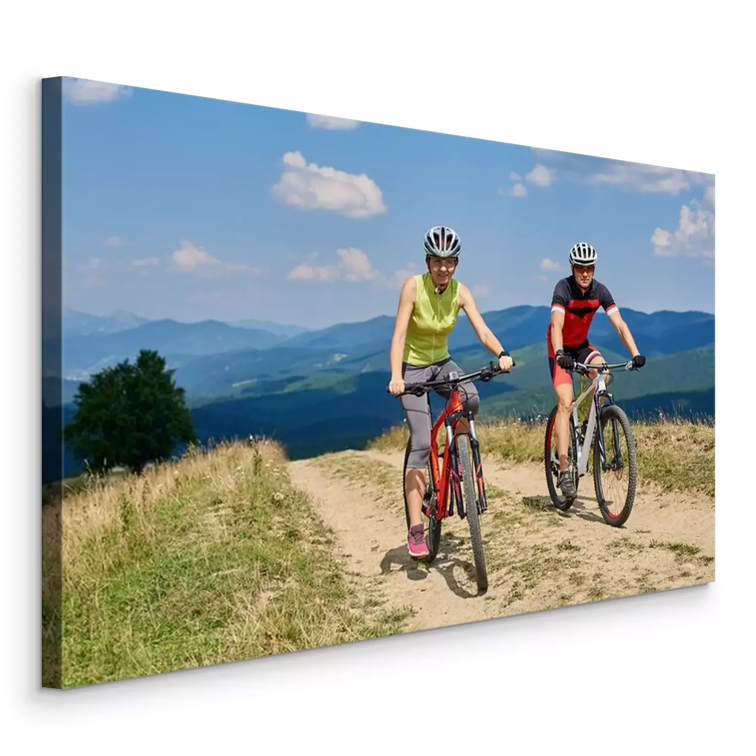Tableau  Smiling cyclists couple man and woman in professional sportswear and helmets cycling cross country bikes on the mountain road on bright sunny summer day. Active lifestyle and happy relations concept