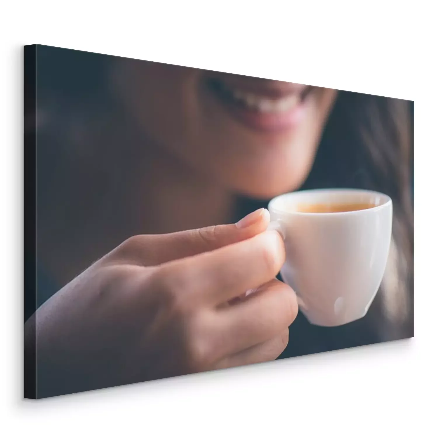 Tableau : Smiling woman holing hot espresso coffee on hand at cafe in the morning