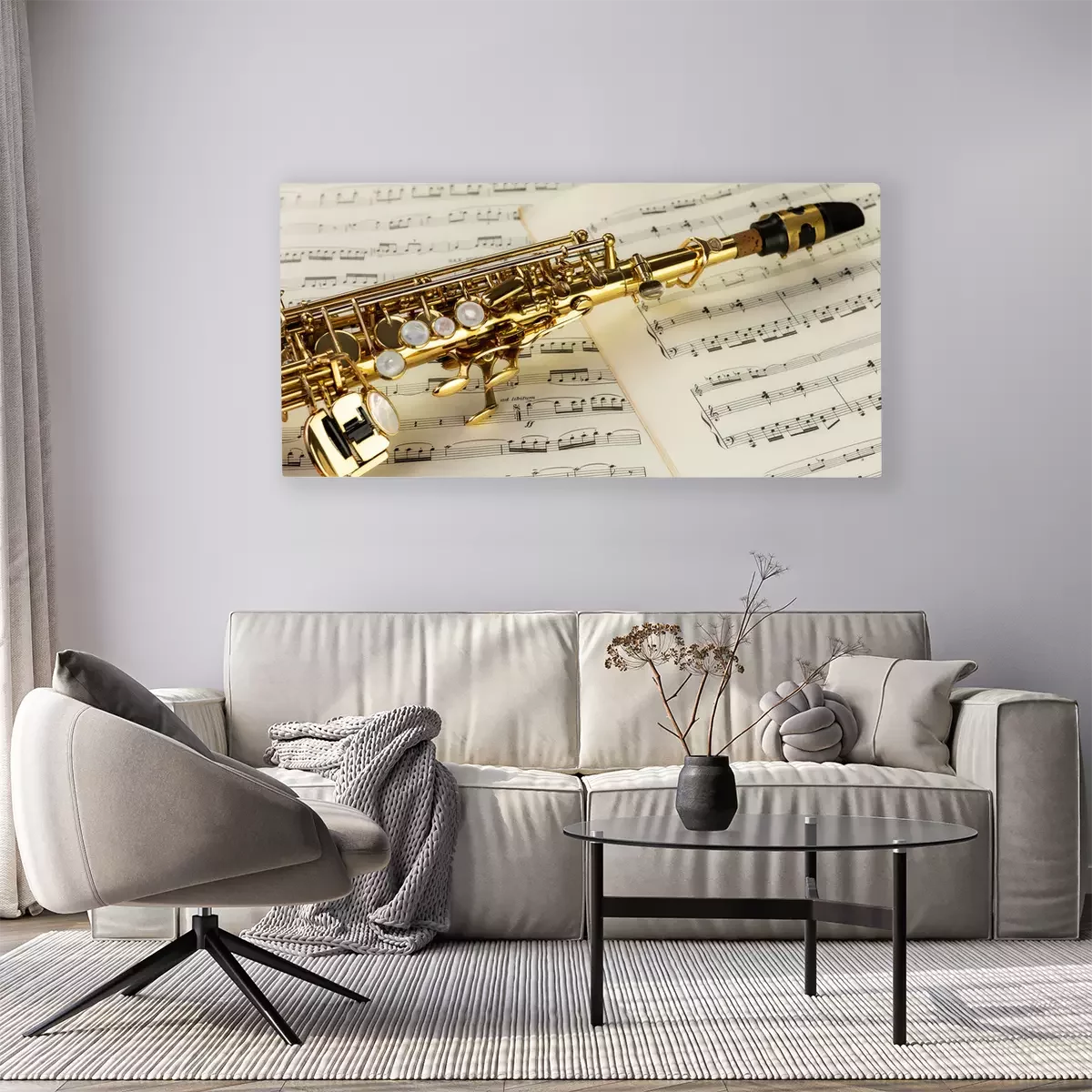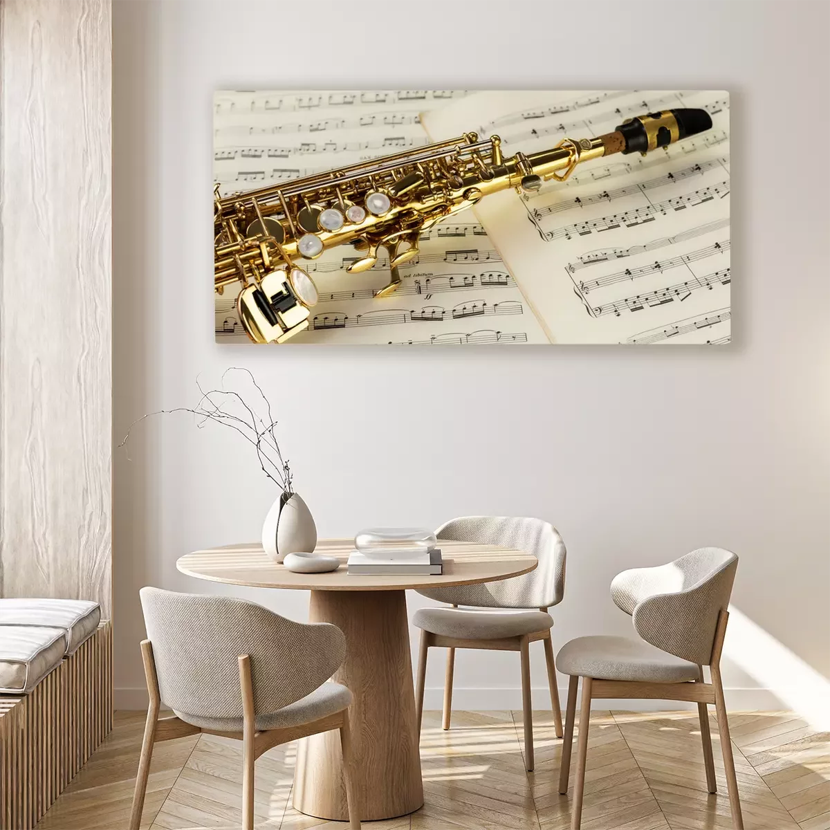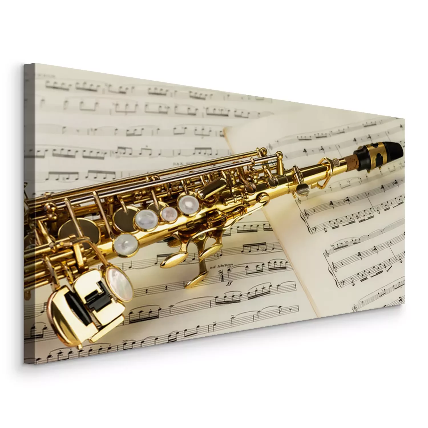 Tableau  Soprano Saxophone in close-up on musical notes