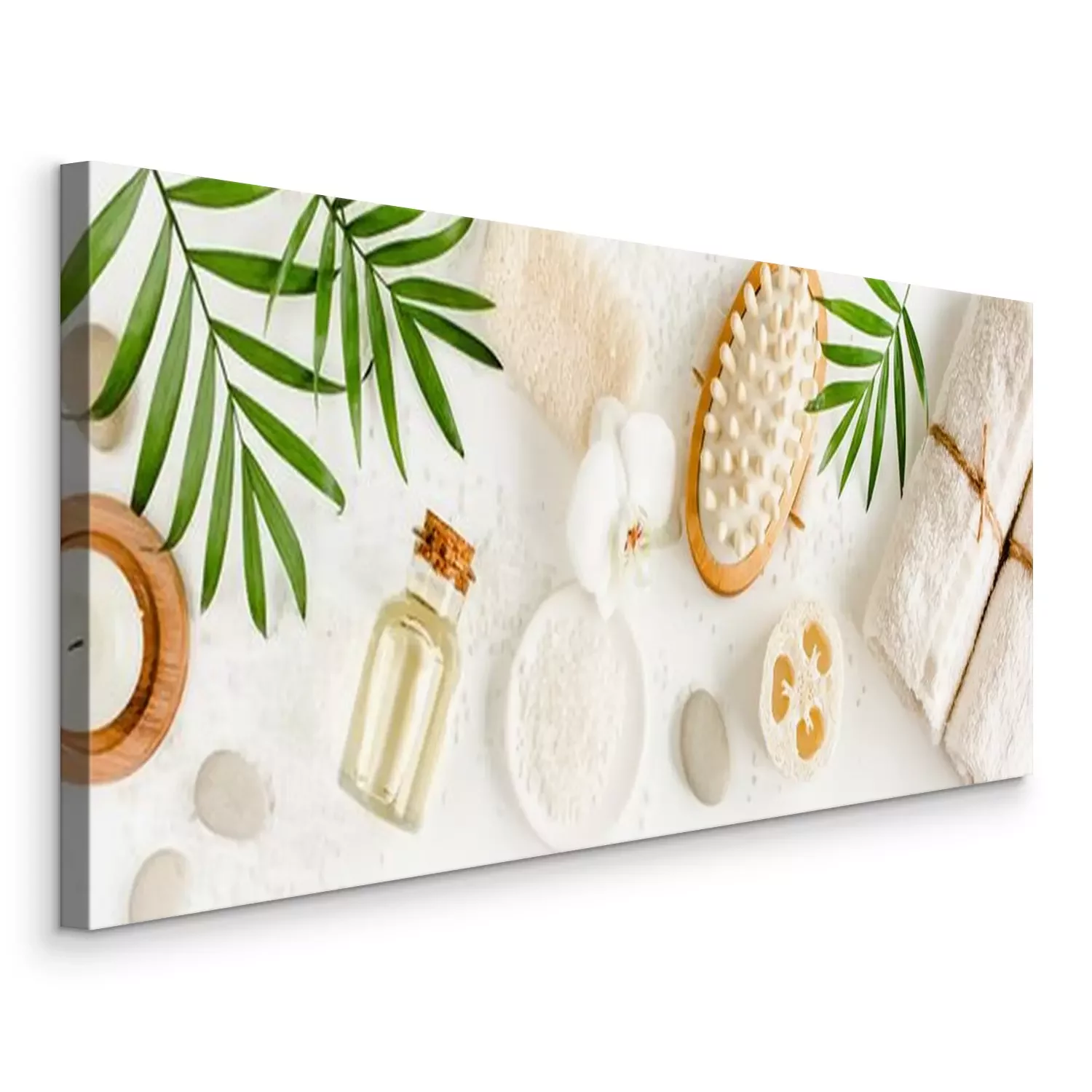Tableau : Spa Background. Natural/Organic spa cosmetics products, eco friendly bathroom accessories, eucalyptus leaves. Skincare concept on white background. Flat lay, top view
