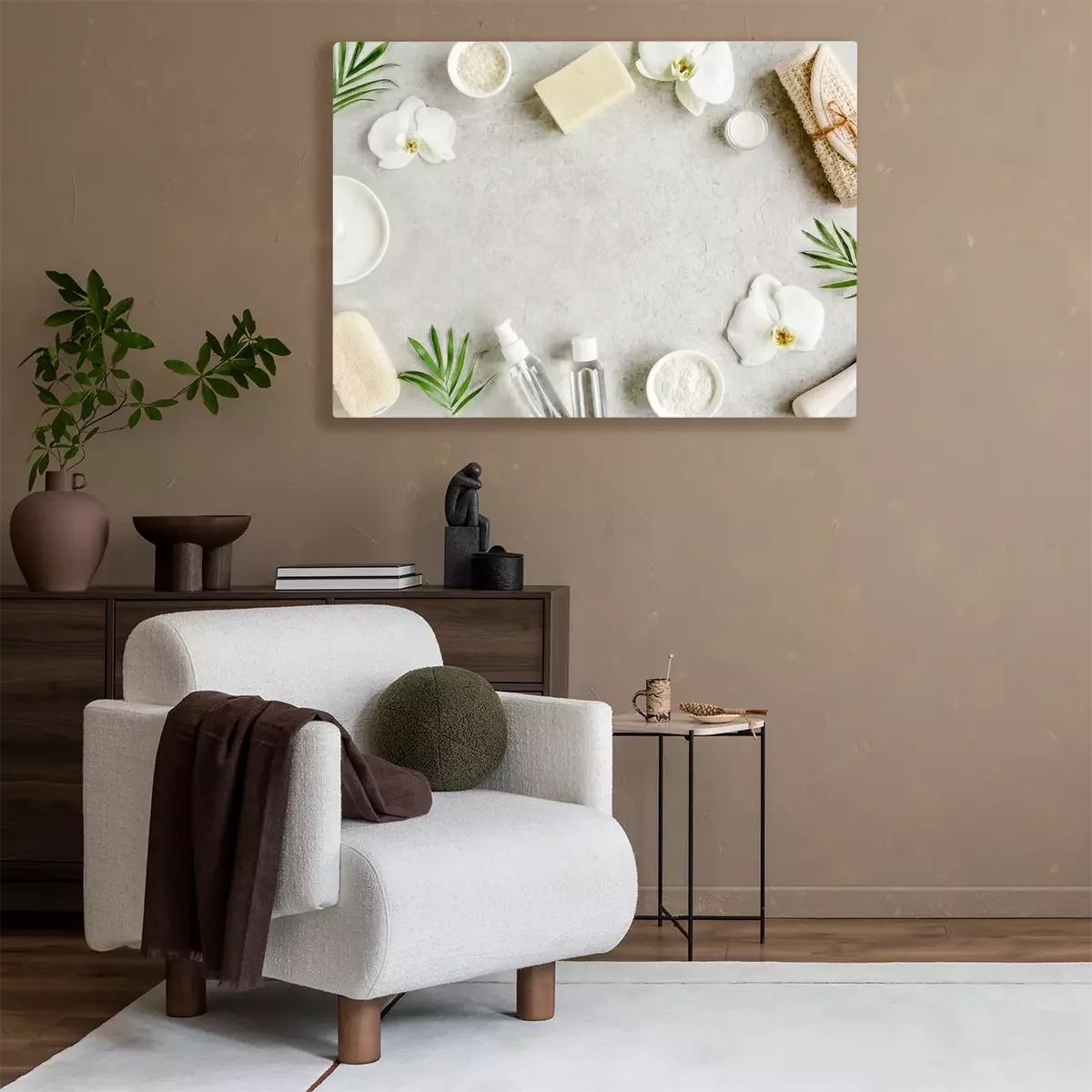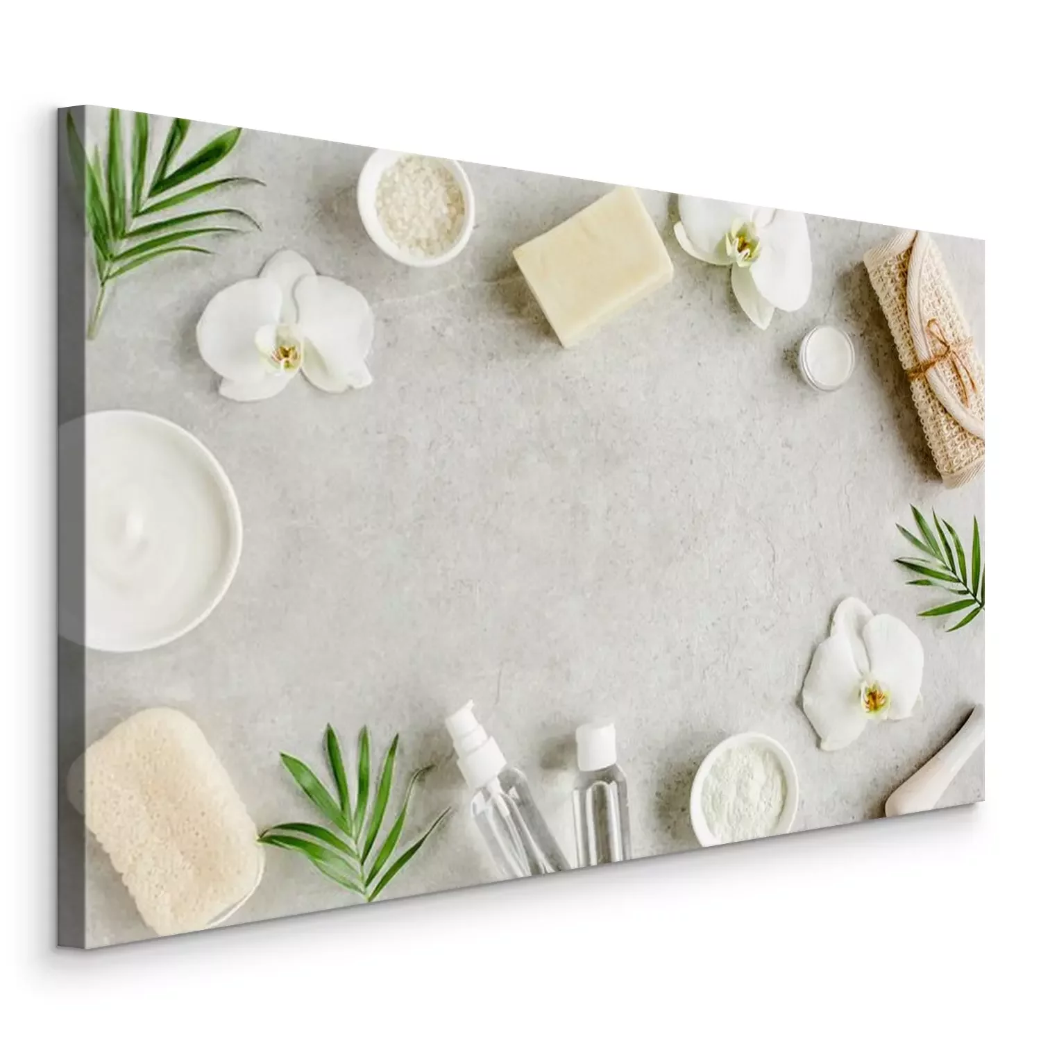 Tableau  Spa skincare concept. Natural/Organic spa cosmetics products, sea salt and tropic palm leaves on gray marble table from above. Spa background with a space for a text, flat lay, top view.
