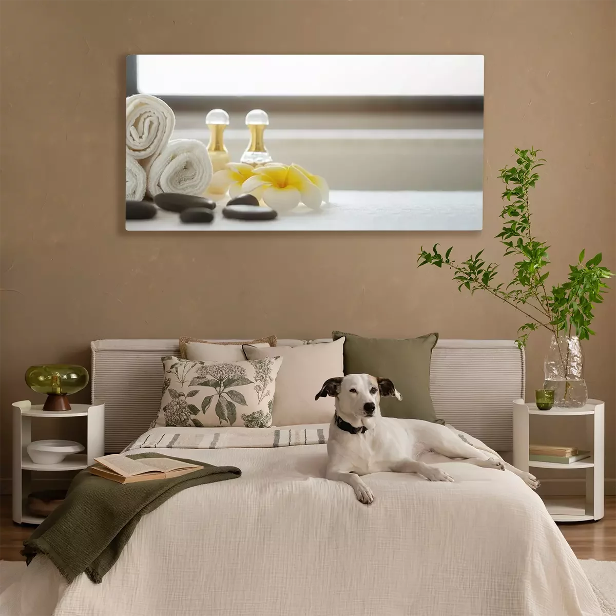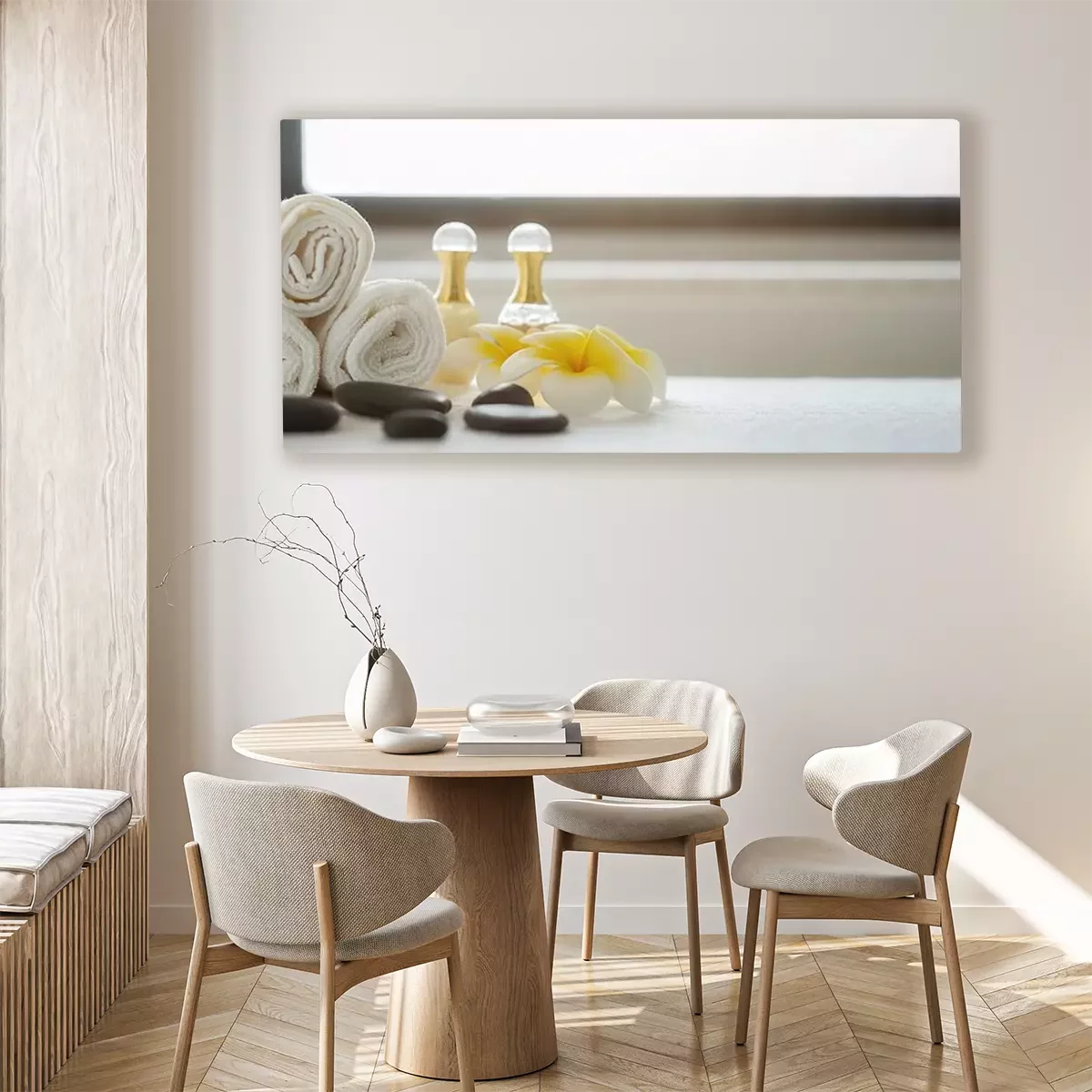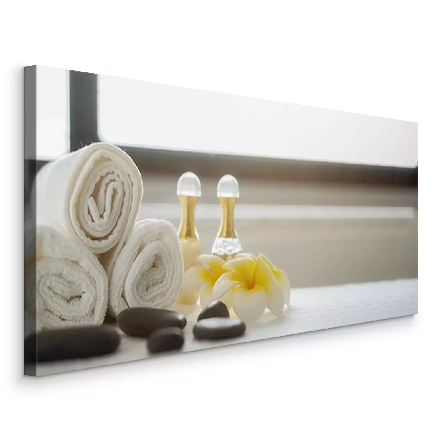 Tableau  Spa treatment concept. Spa background with spa accessories on white bathroom background.