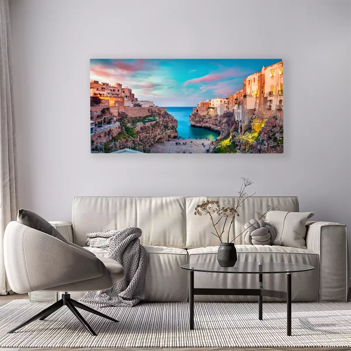 Tableau : Spectacular spring cityscape of Polignano a Mare town, Puglia region, Italy, Europe. Colorful evening seascape of Adriatic sea. Traveling concept background..