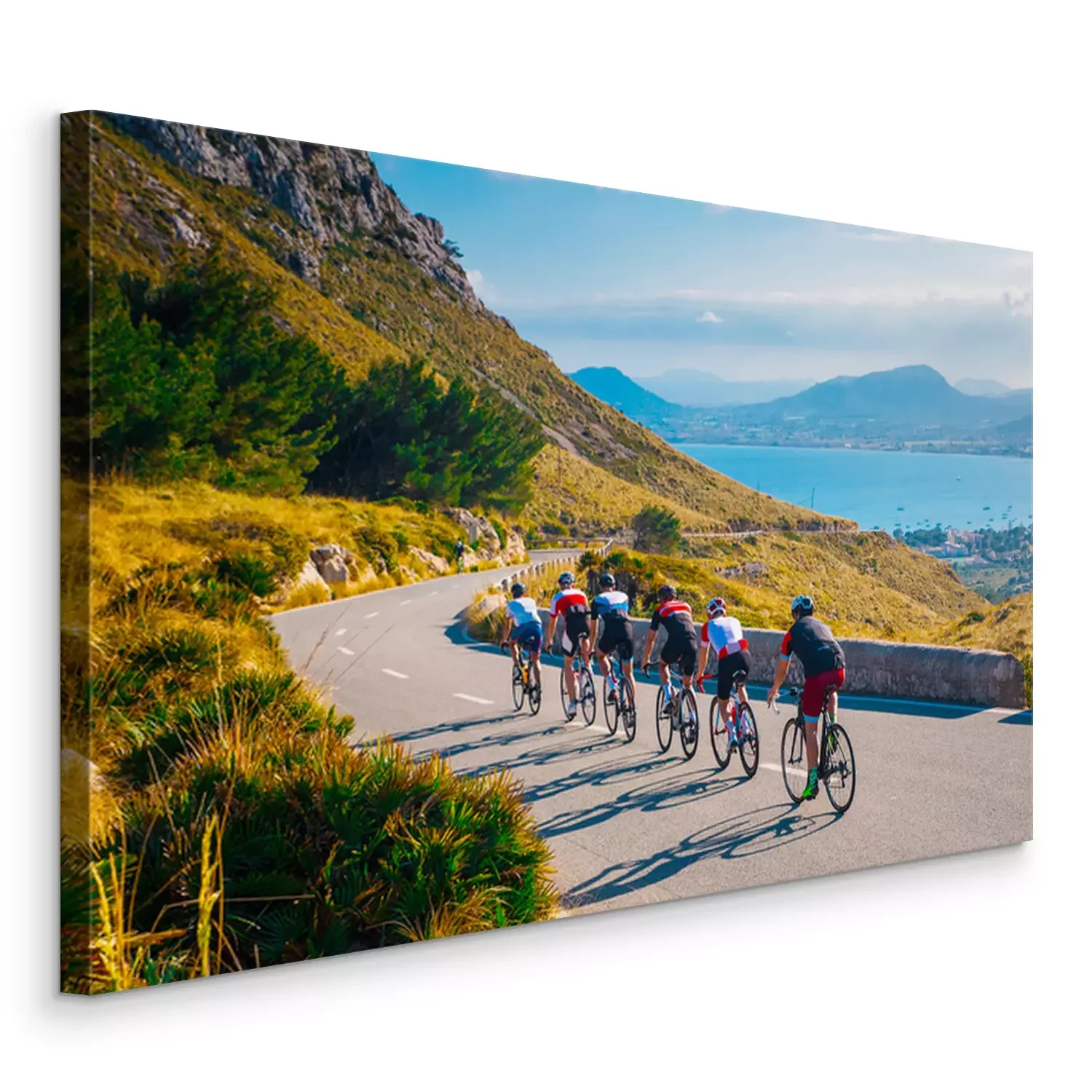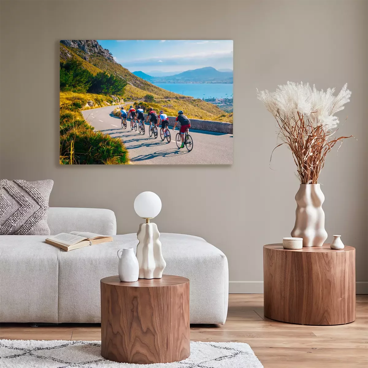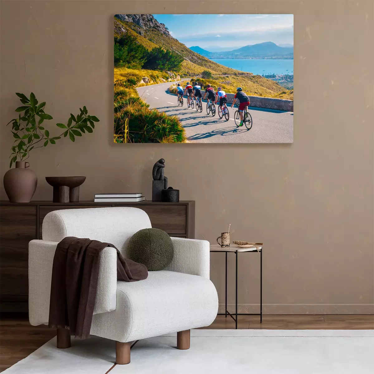 Tableau : Sporty friends on bicycle on sunset light in beautiful nature by the sea. Road cycling on the coast. Sport in Nature background. Teamwork concept photo