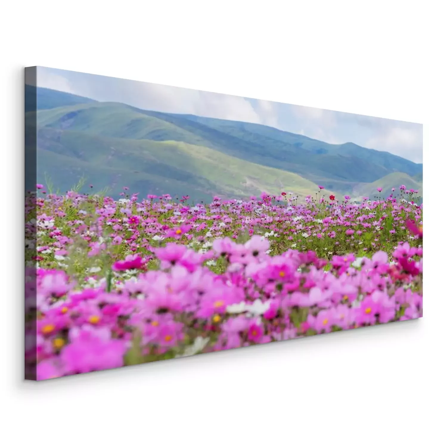 Tableau  Spring landscape. Field of pink flowers with green hill in spring