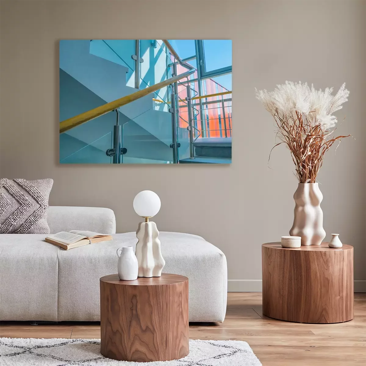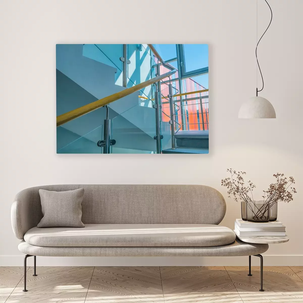 Tableau  Stainless steel, glass and wood railing.Fall Protection. modern design of handrail and staircase