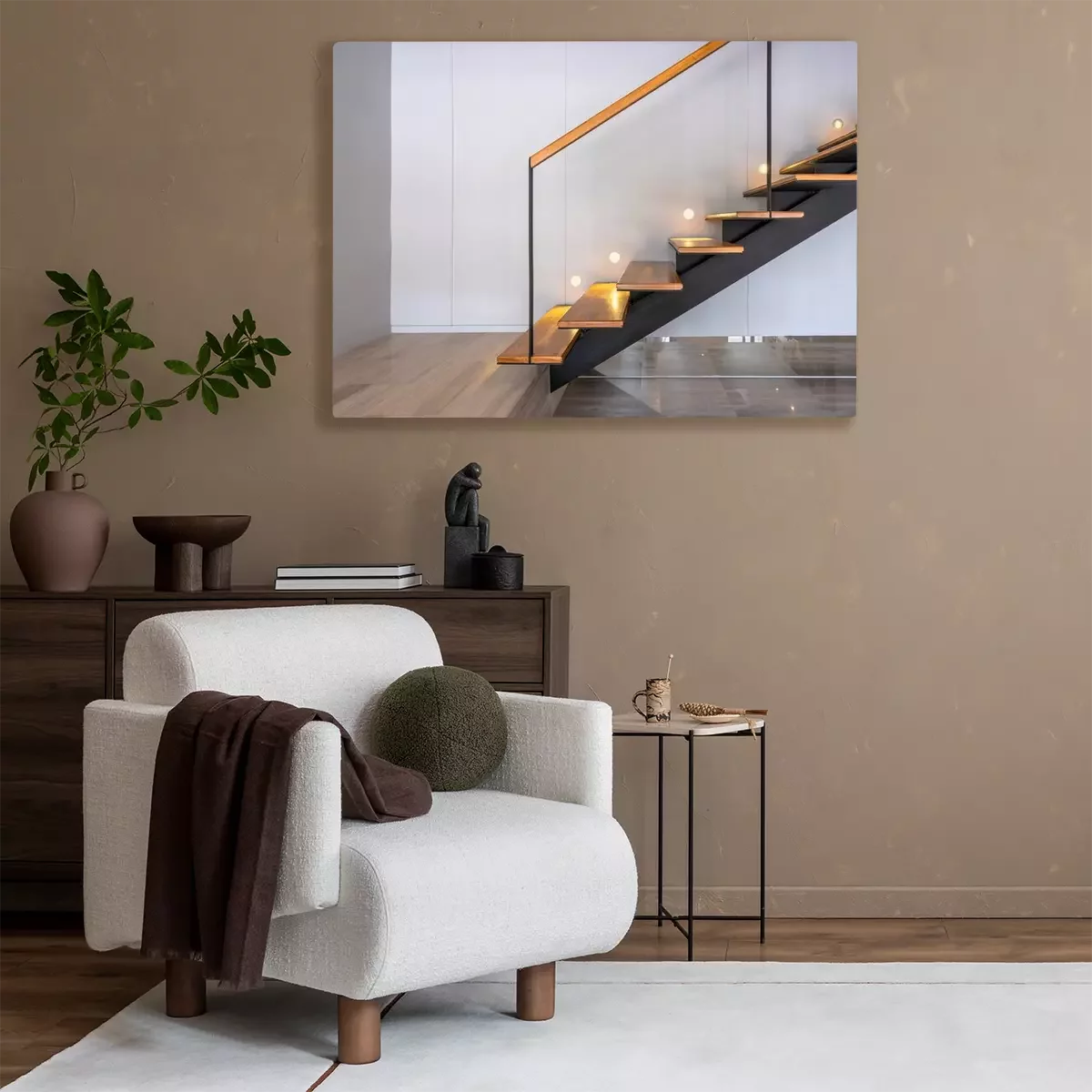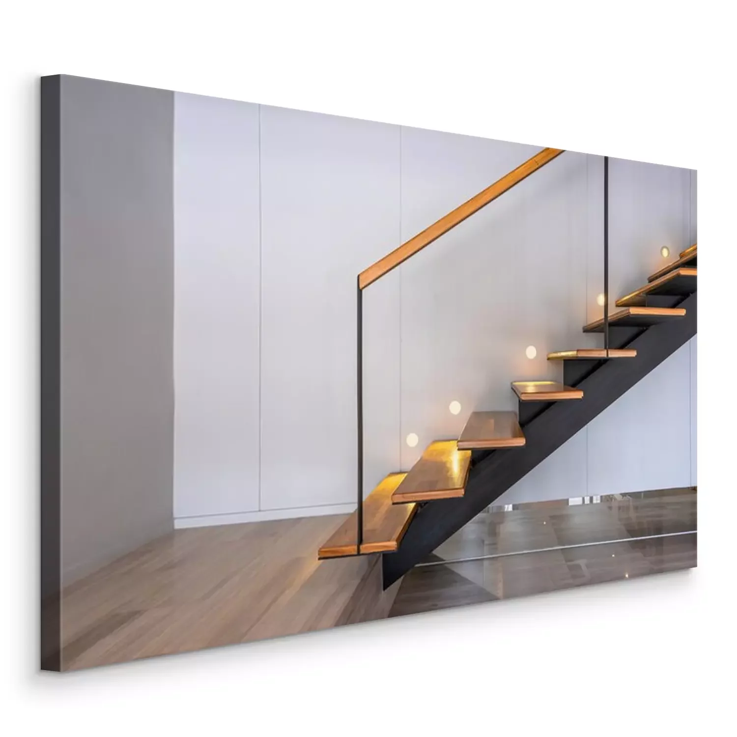 Tableau  Stairway lights bulb for illumination as safety protection wooden stairs architecture interior design, Modern house building