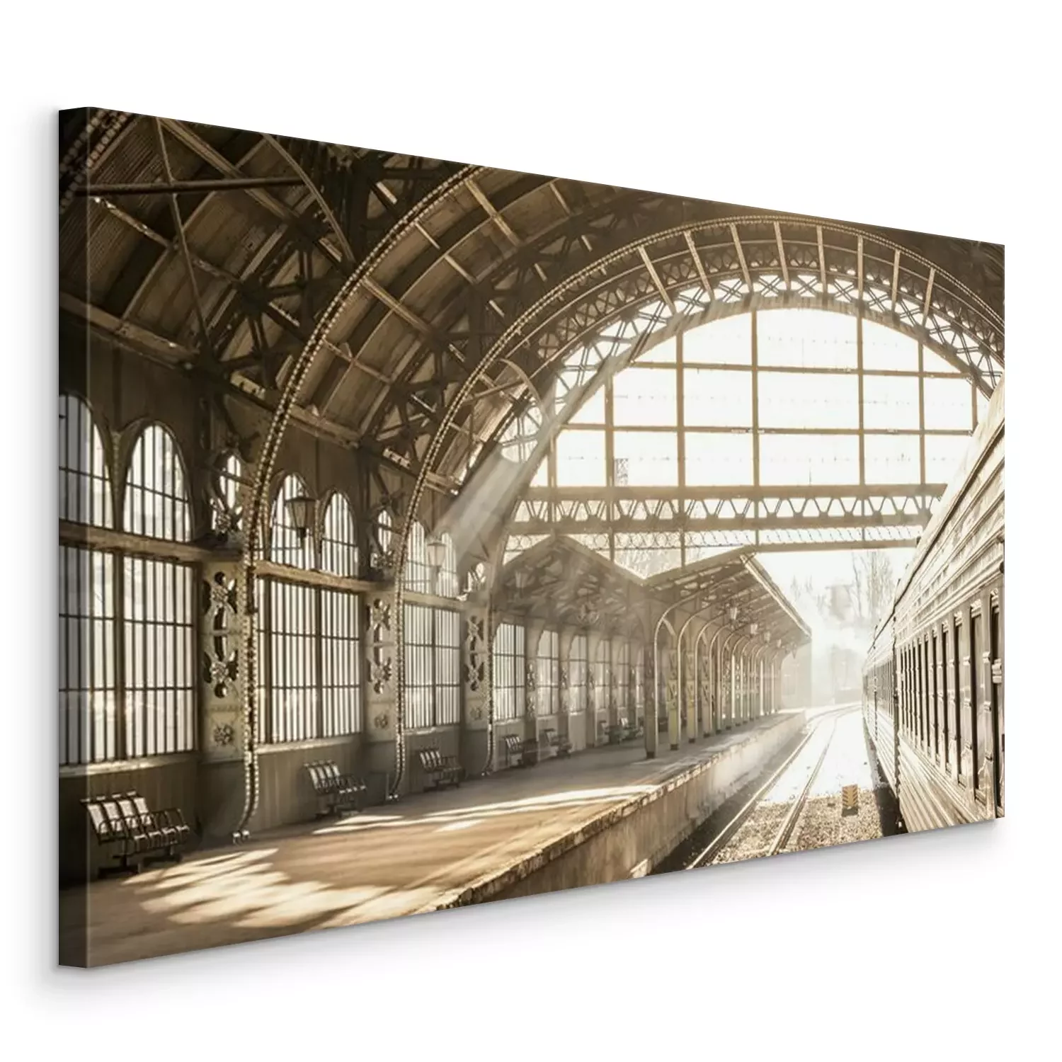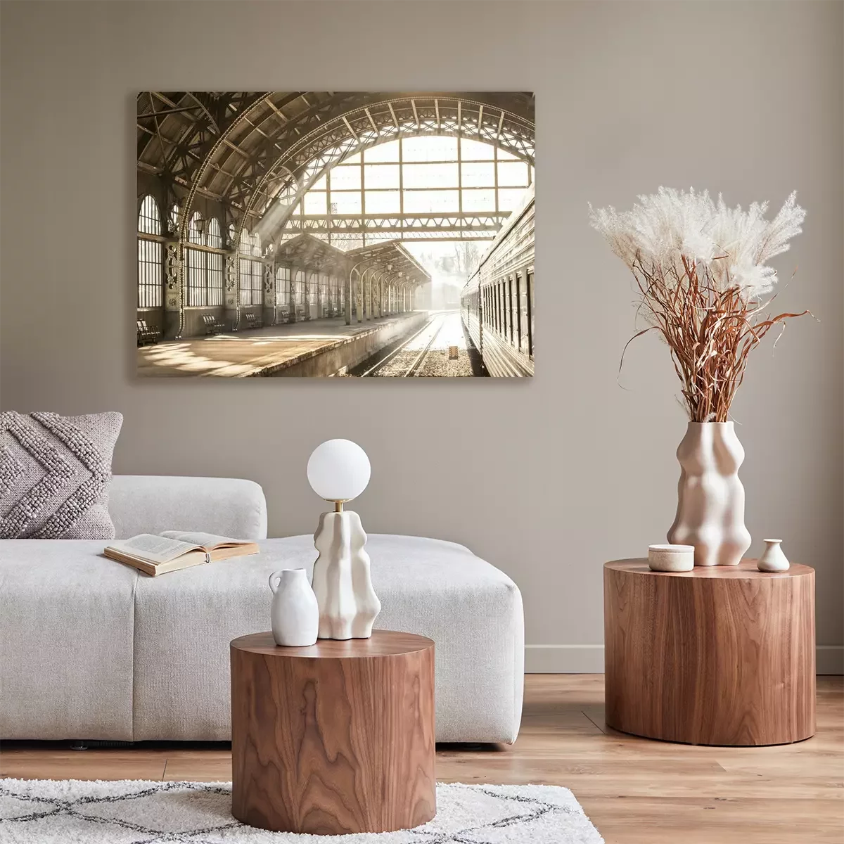 Tableau  Station de train coucher de soleil couvert coucher de soleil en sépia. Transport et plate-forme avec toit de construction. Voyage en train sur le chemin de fer