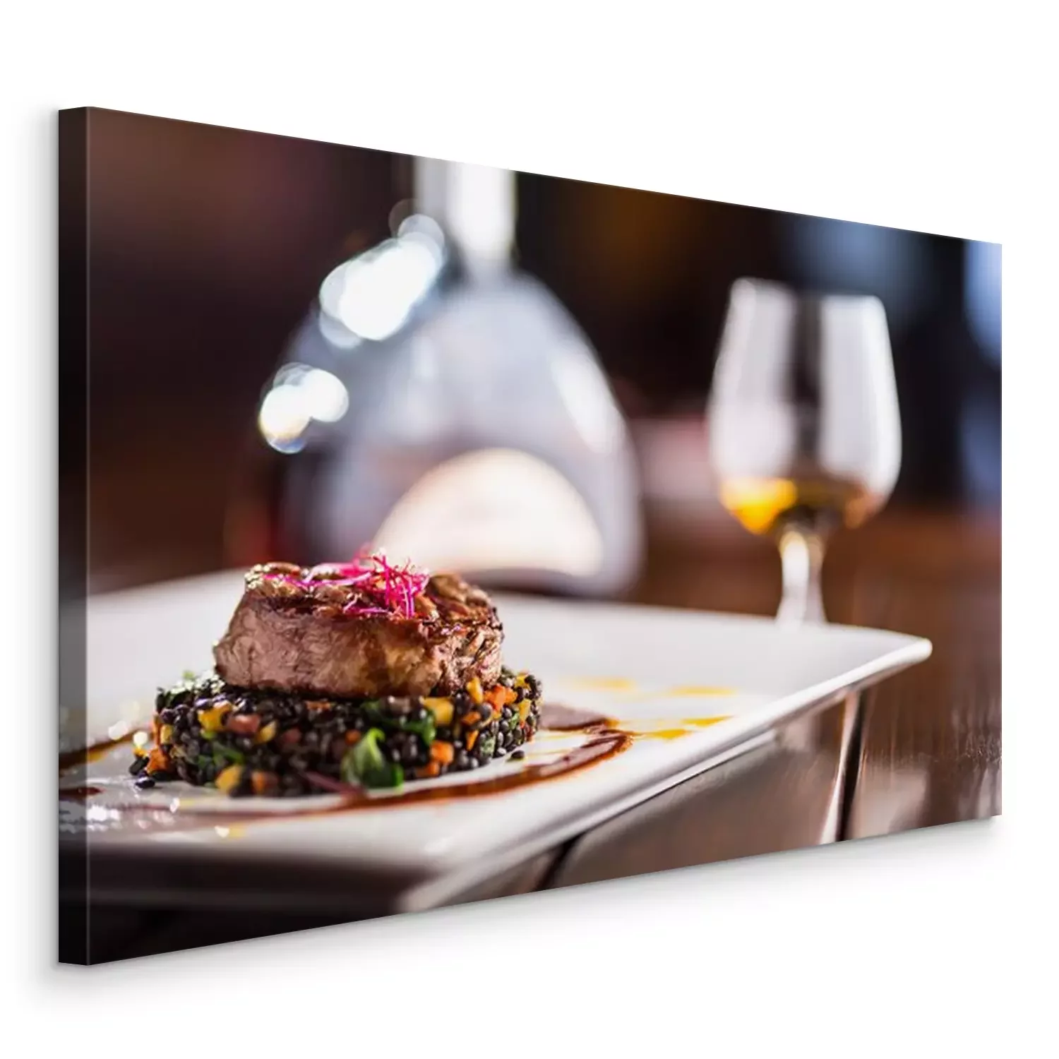 Tableau  Steak de bœuf. Grill bœuf steak lentilles noires mélangées avec des légumes. Cognac ou brandy comme boisson. Nourriture culinaire au pub ou au restaurant de l'hôtel