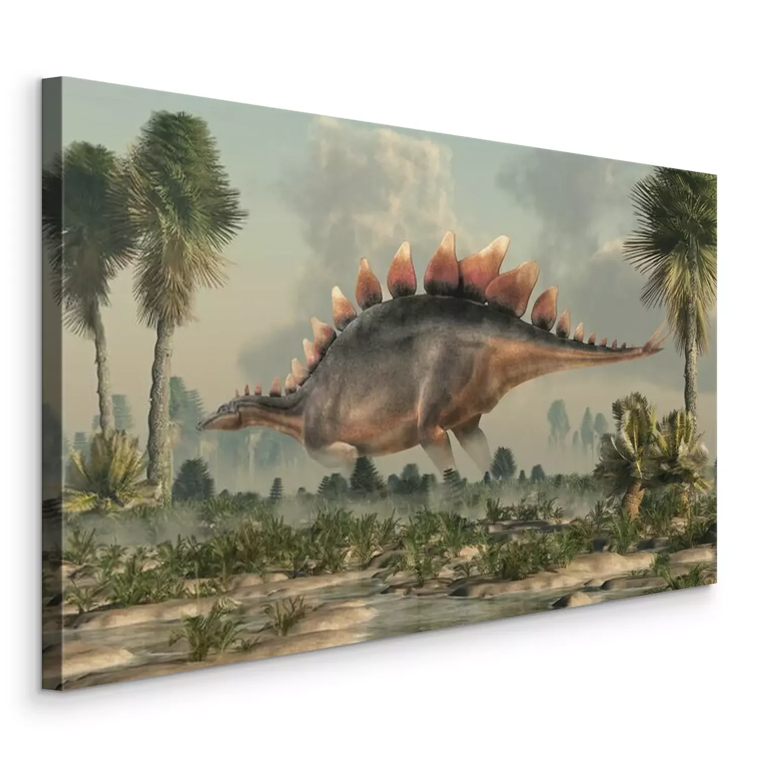 Tableau : Stegosaurus, was a thyreophoran dinosaur. An herbivore, it is one of the best known dinosaurs of the Jurassic period. Here, a grey and brown one is standing in profile in a wetland. 3D Rendering.