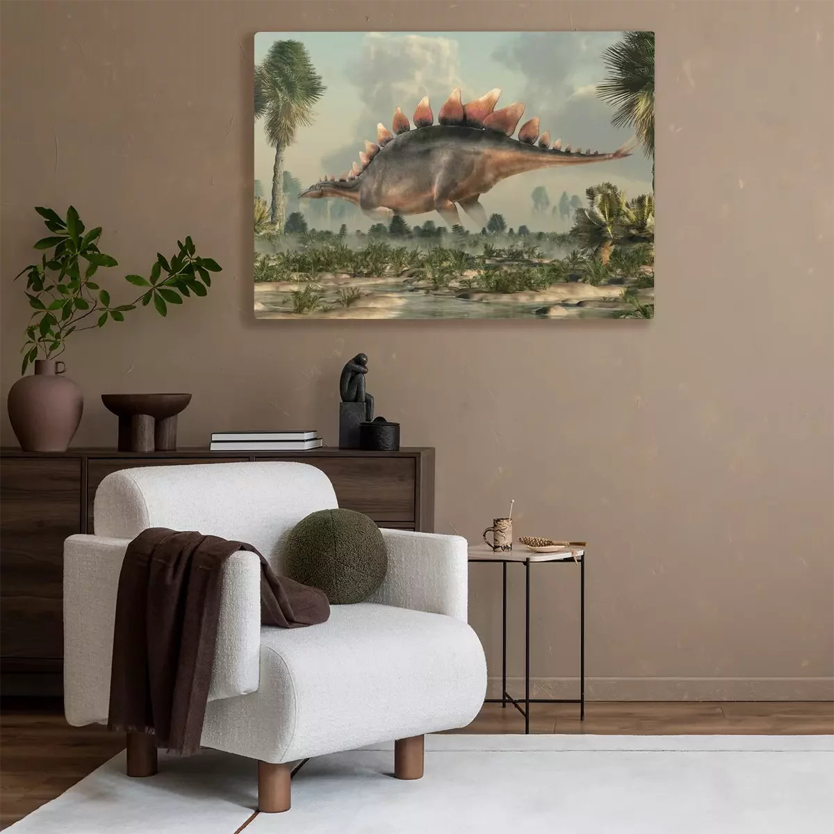 Tableau  Stegosaurus, was a thyreophoran dinosaur. An herbivore, it is one of the best known dinosaurs of the Jurassic period. Here, a grey and brown one is standing in profile in a wetland. 3D Rendering.