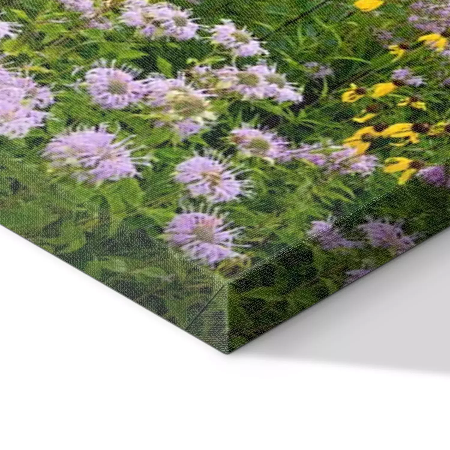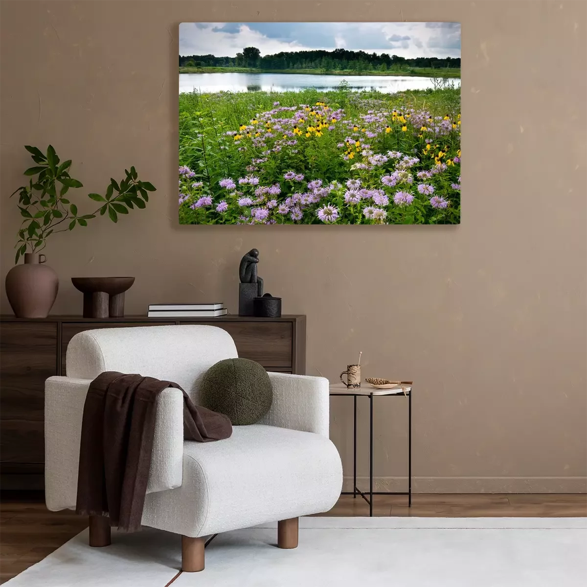 Tableau  Storm clouds move along the horizon over summer wildflowers and a small pond.