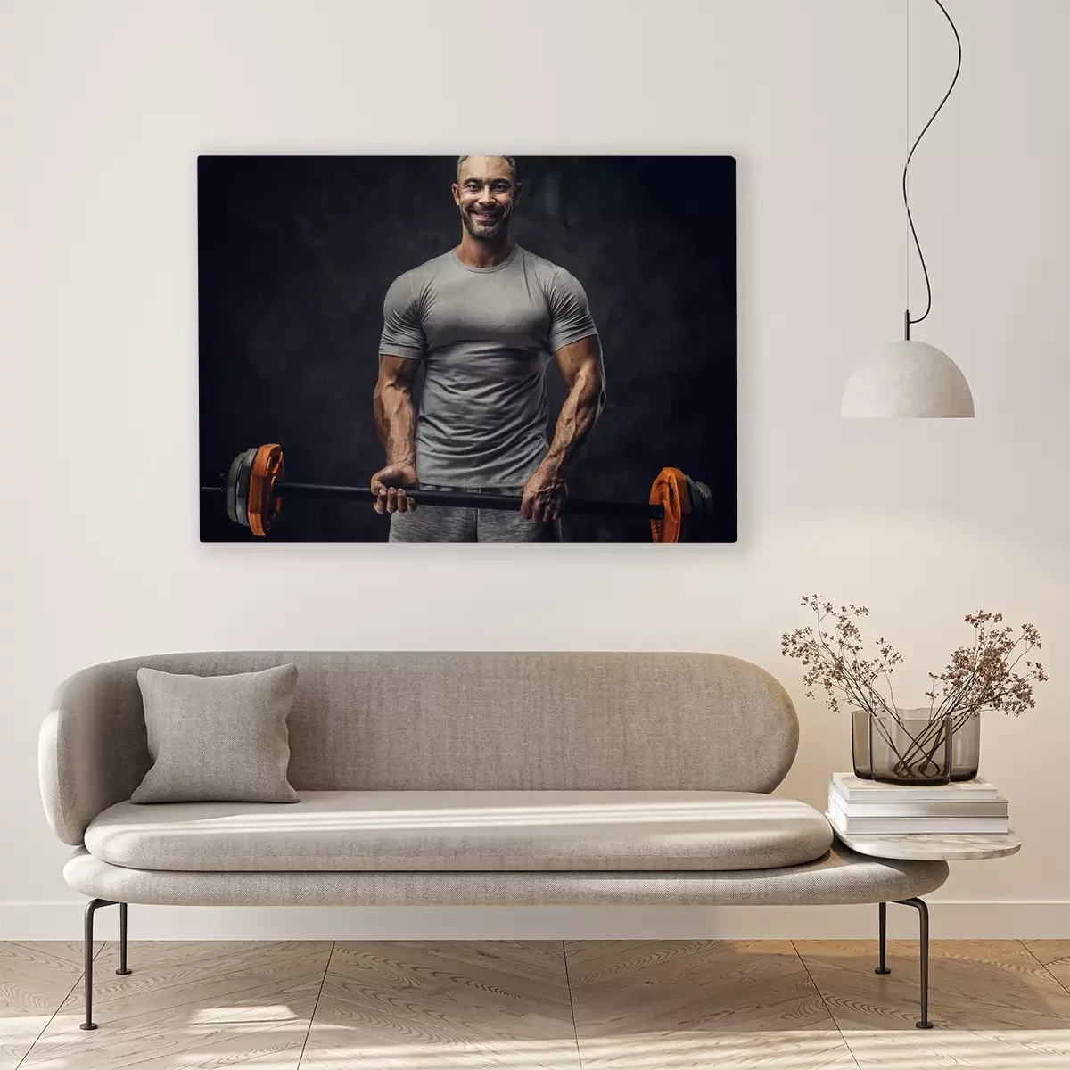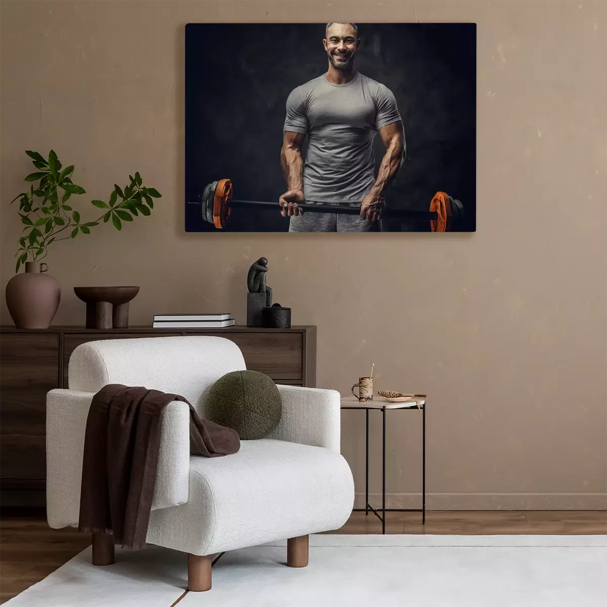 Tableau  Strong, adult, fit muscular caucasian man coach posing for a photoshoot in a dark studio under the spotlight wearing grey sportswear, showing his muscles and holding a sport gear looking confident and