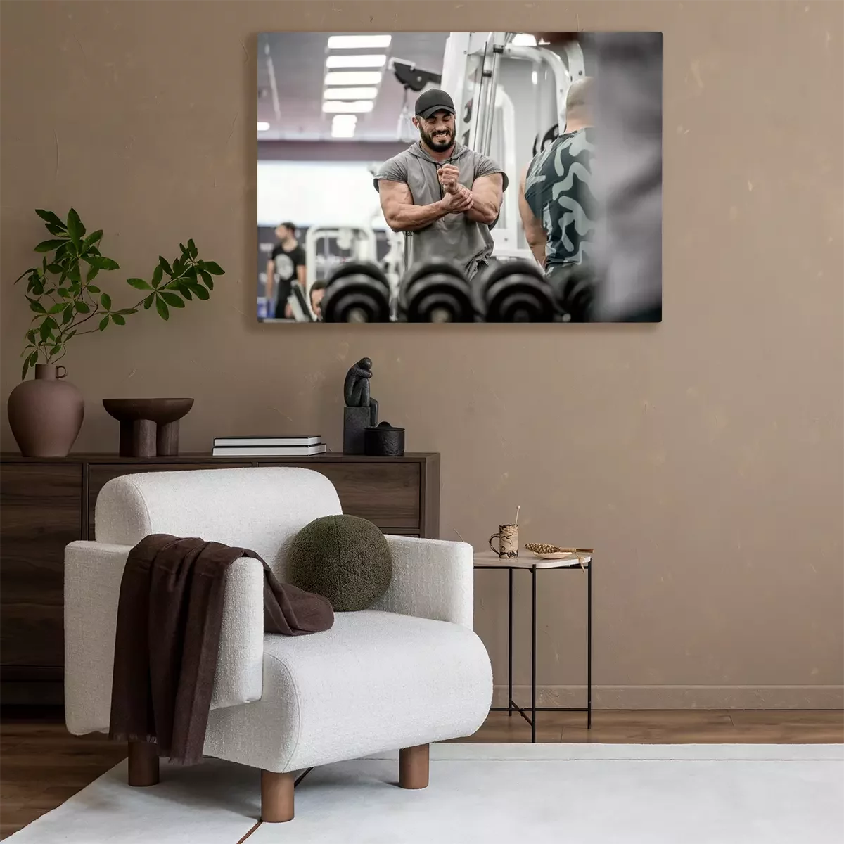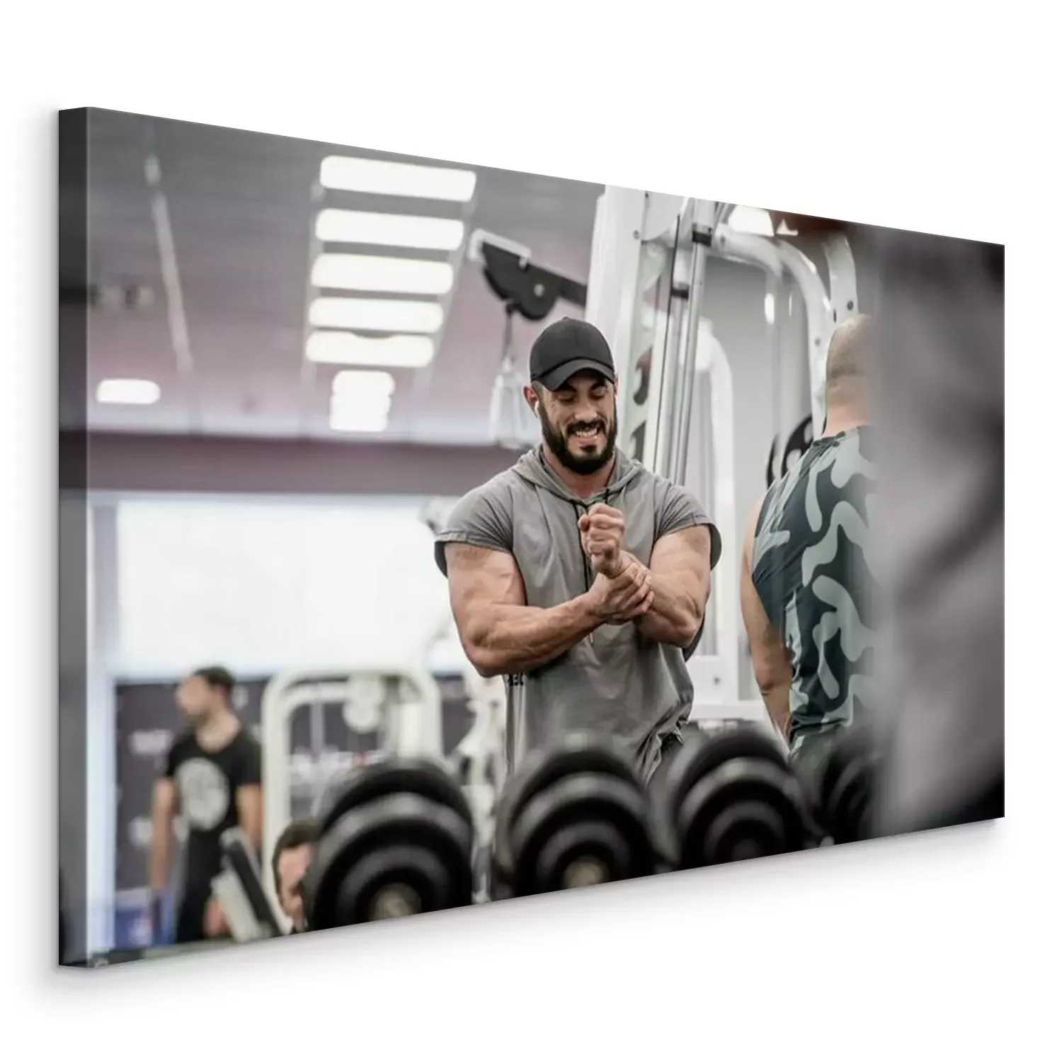 Tableau : Strong muscle bearded caucasian athlete man holding his wrist with hand during sport training injury with grimace of pain on his face indoor gym