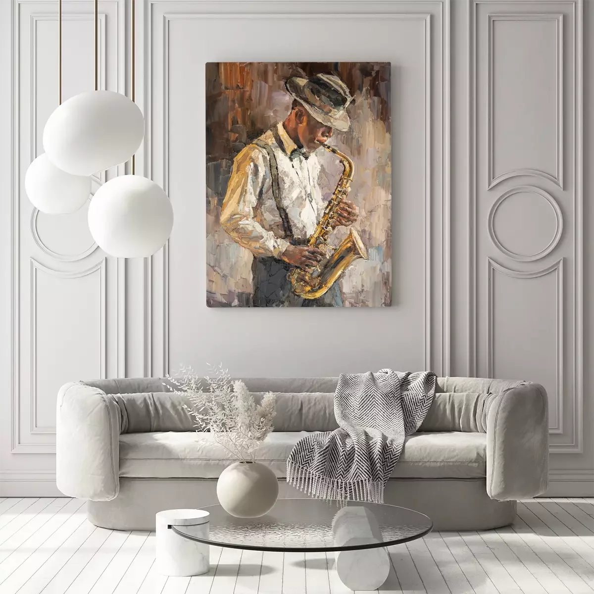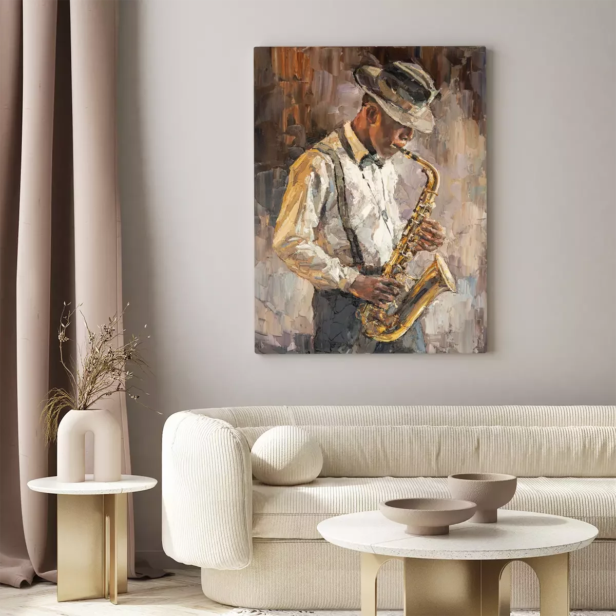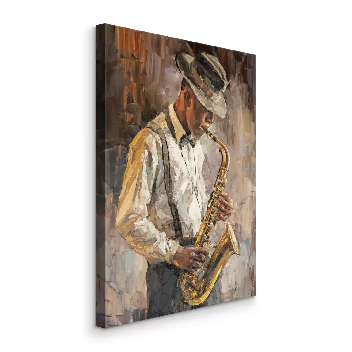 Tableau : Stylish jazz band playing music on the scene, background is brown. Palette knife technique of oil painting and brush. .The jazzman plays the sexophone.