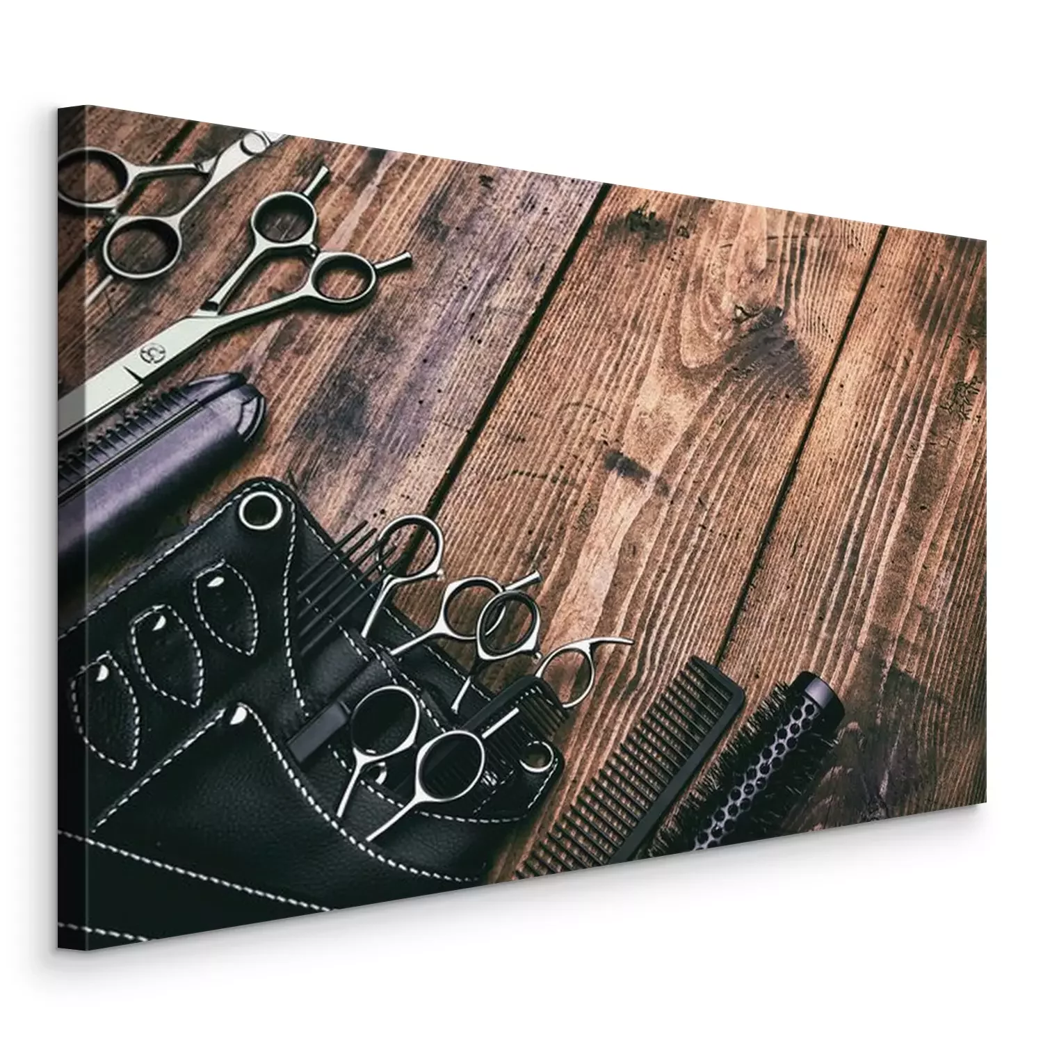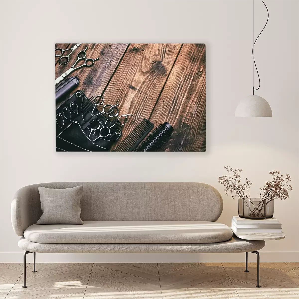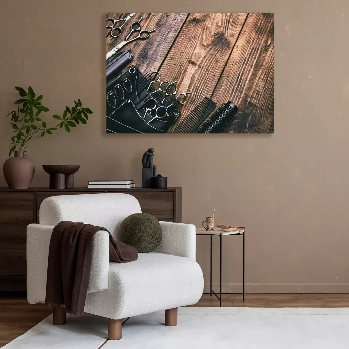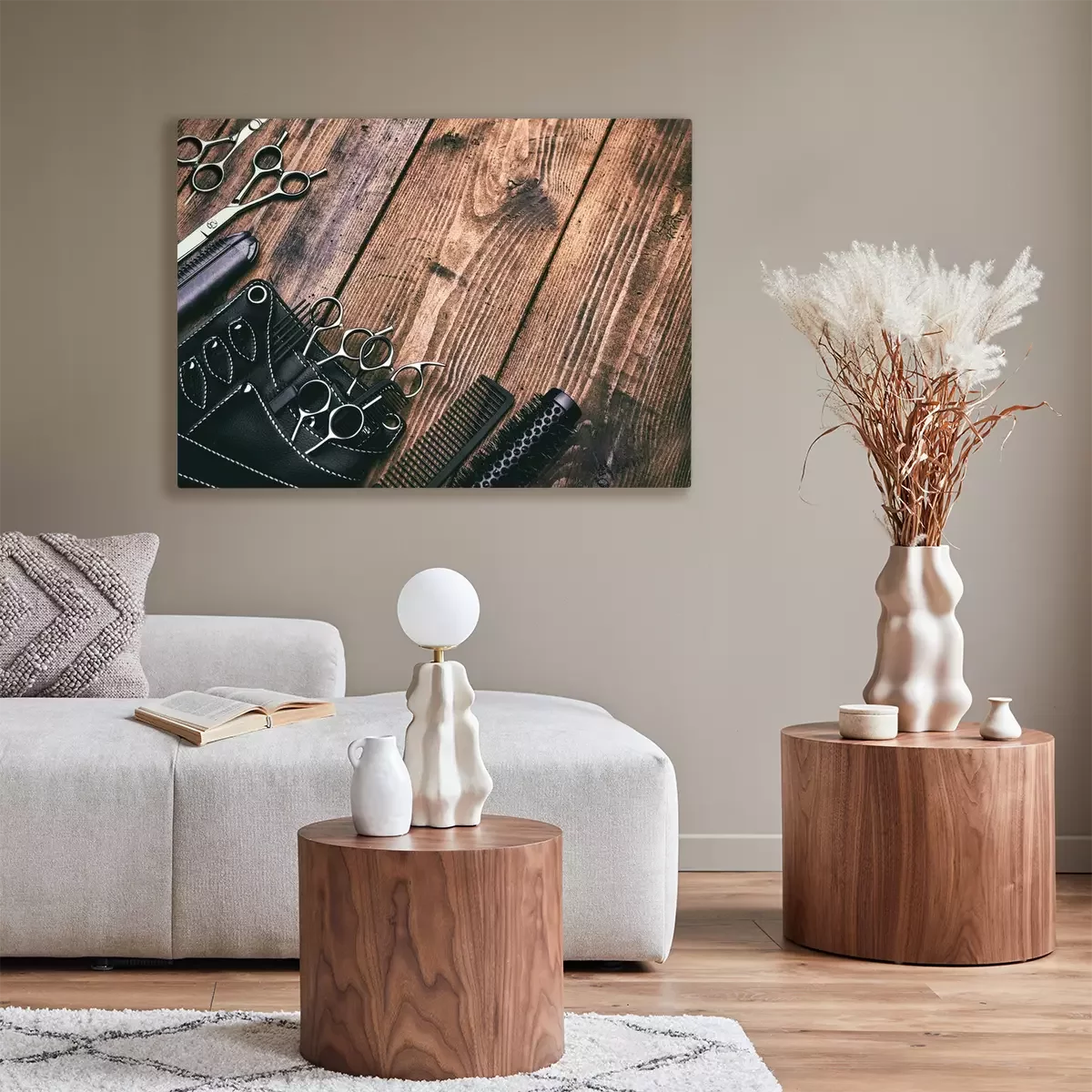 Tableau  Stylish professional barber scissors on vintage wooden table, hairdresser salon concept, hairdressing tool set. Haircut accessories