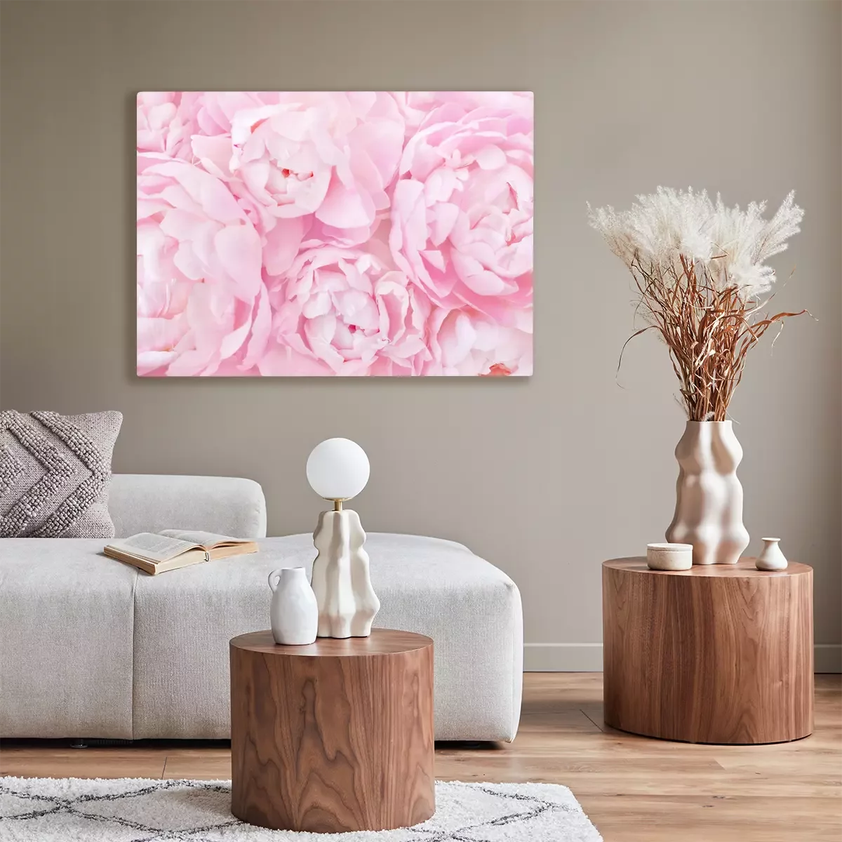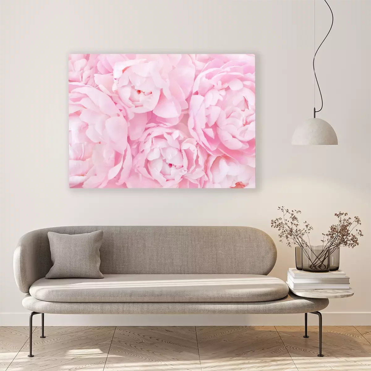 Tableau : Summer blossoming delicate peony frame, blooming peonies flowers festive background, pastel and soft floral card, selective focus, toned