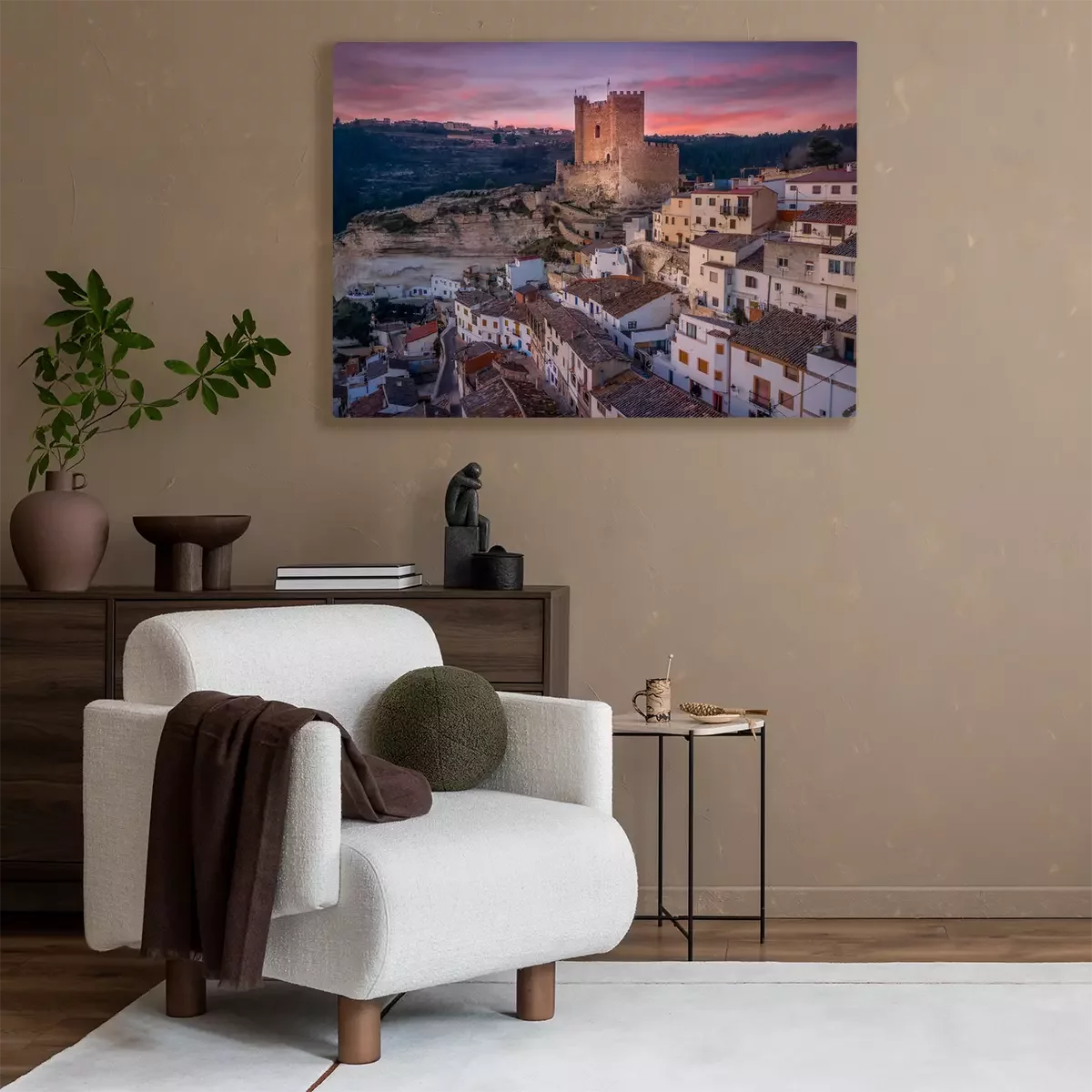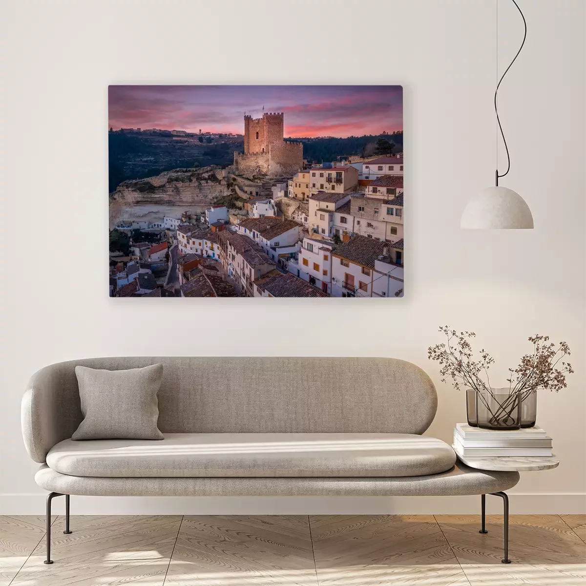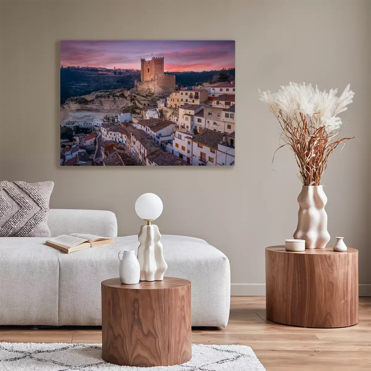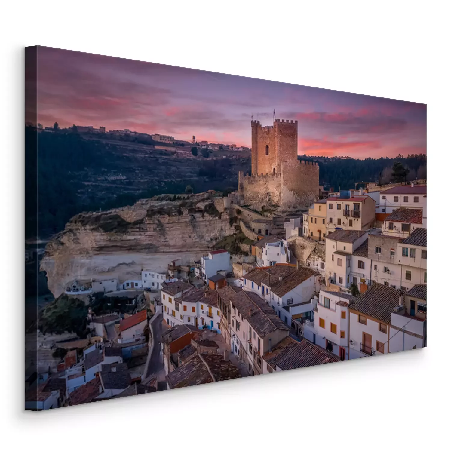 Tableau  Sunset aerial panorama view of Alcala del Jucar medieval historic village with white washed houses and a castle on a rock in Albacete Spain